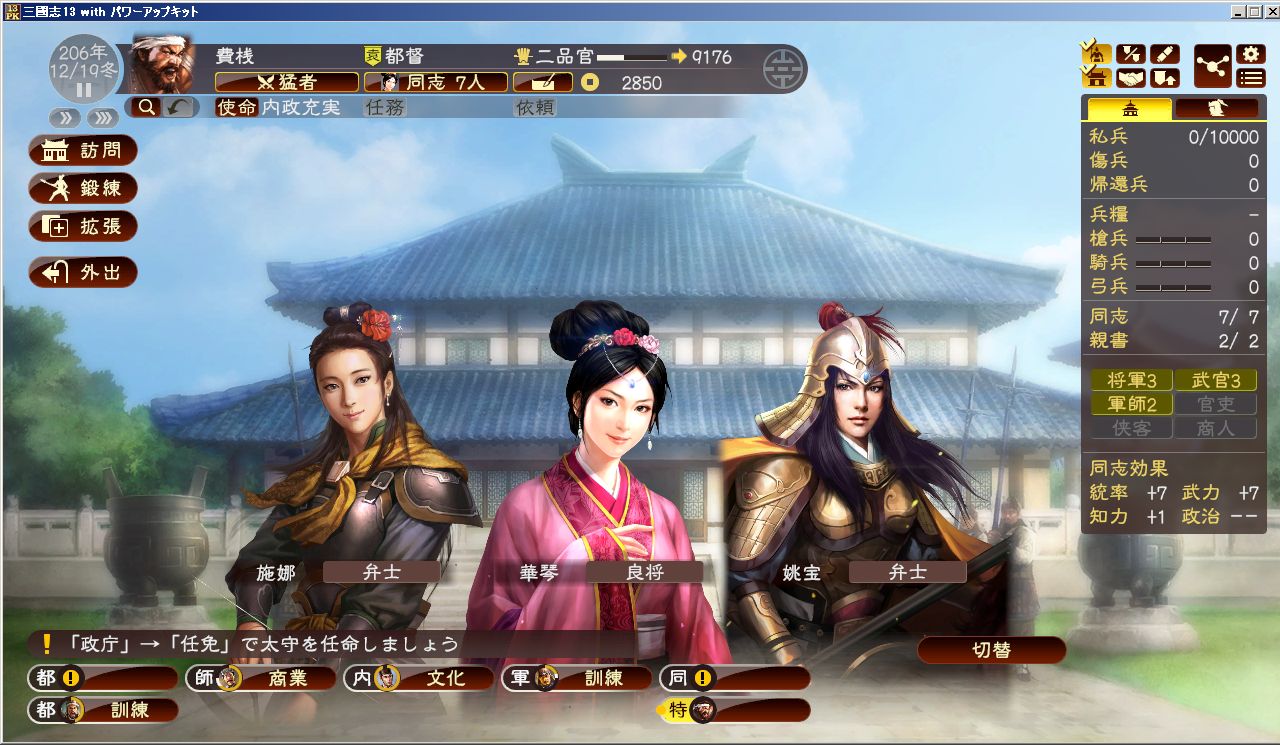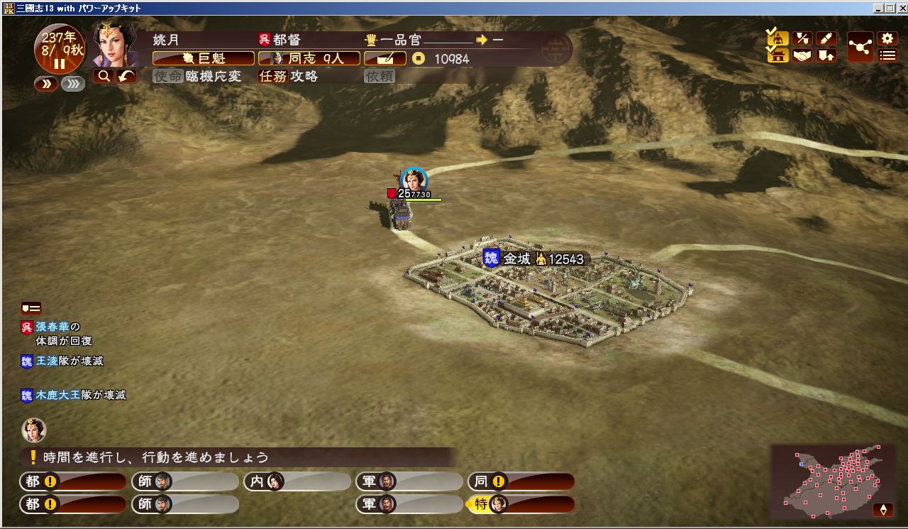 この姚月、統率・武力は関羽と並べるほどの性能を誇っており、知力・政治はまずまずの生粋の武人。早速、都督に任命され、李恢軍の跡を引き継いだ。でも軍師プレイ中だからな~。巨魁目指して、しばらく条件達成に勤しむかな~。その間に魏に都市を奪われまくらなければいいんだけど。心配だなあ~