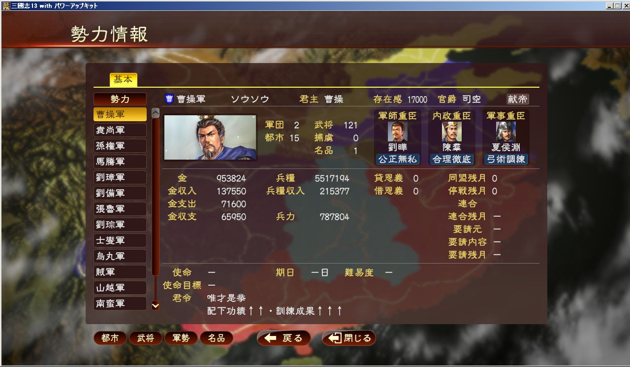 魏 都市:21、武将:122、兵力:125万、捕虜:3