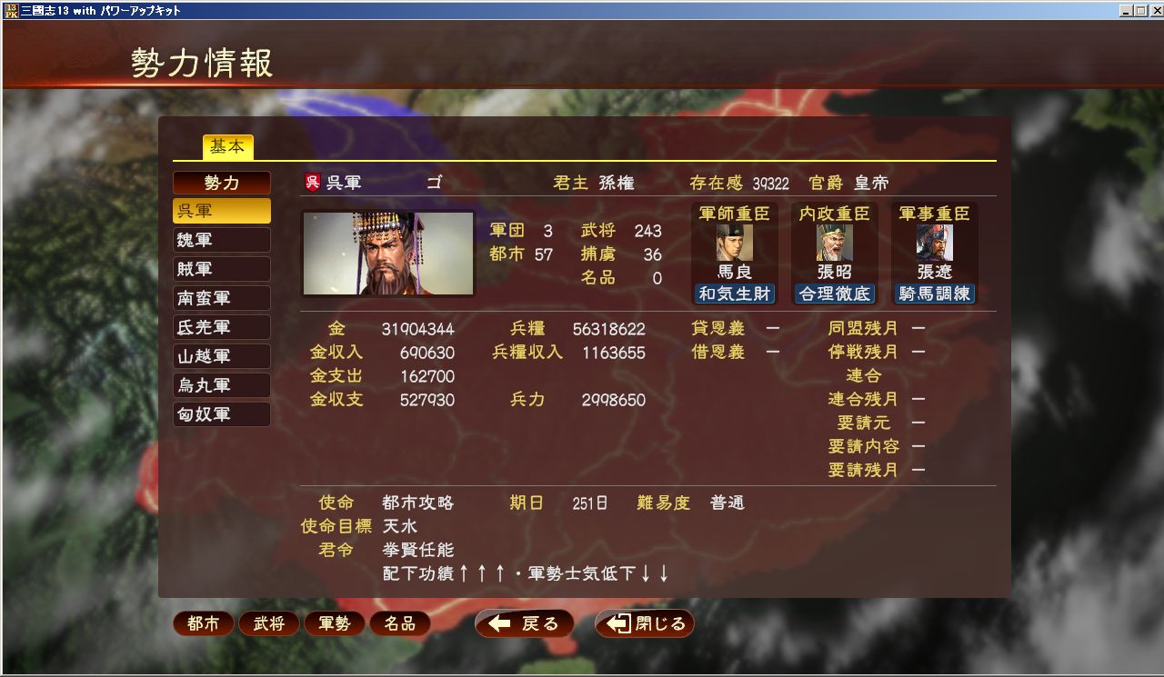 呉 都市:57、武将:243、兵力:300万、捕虜:36