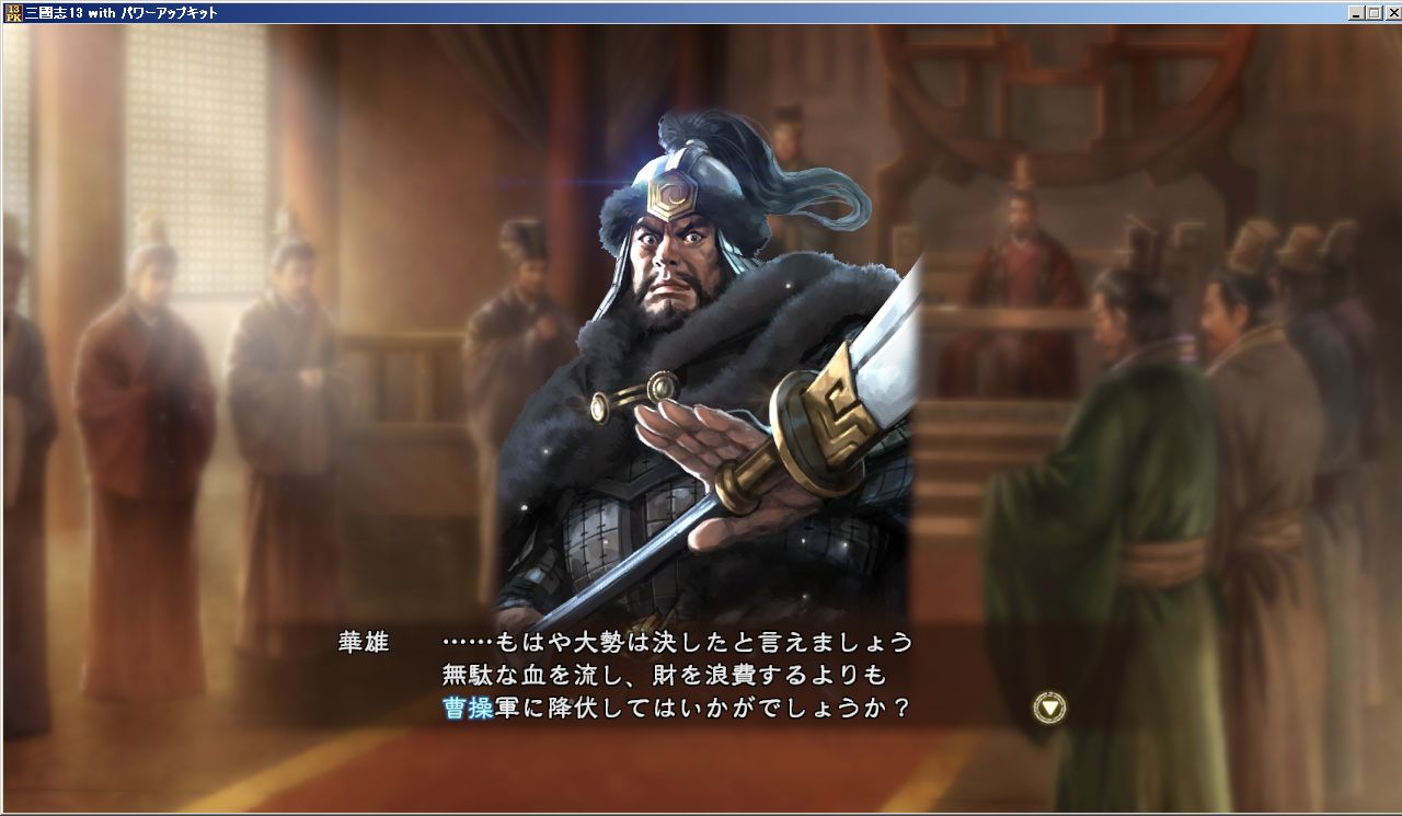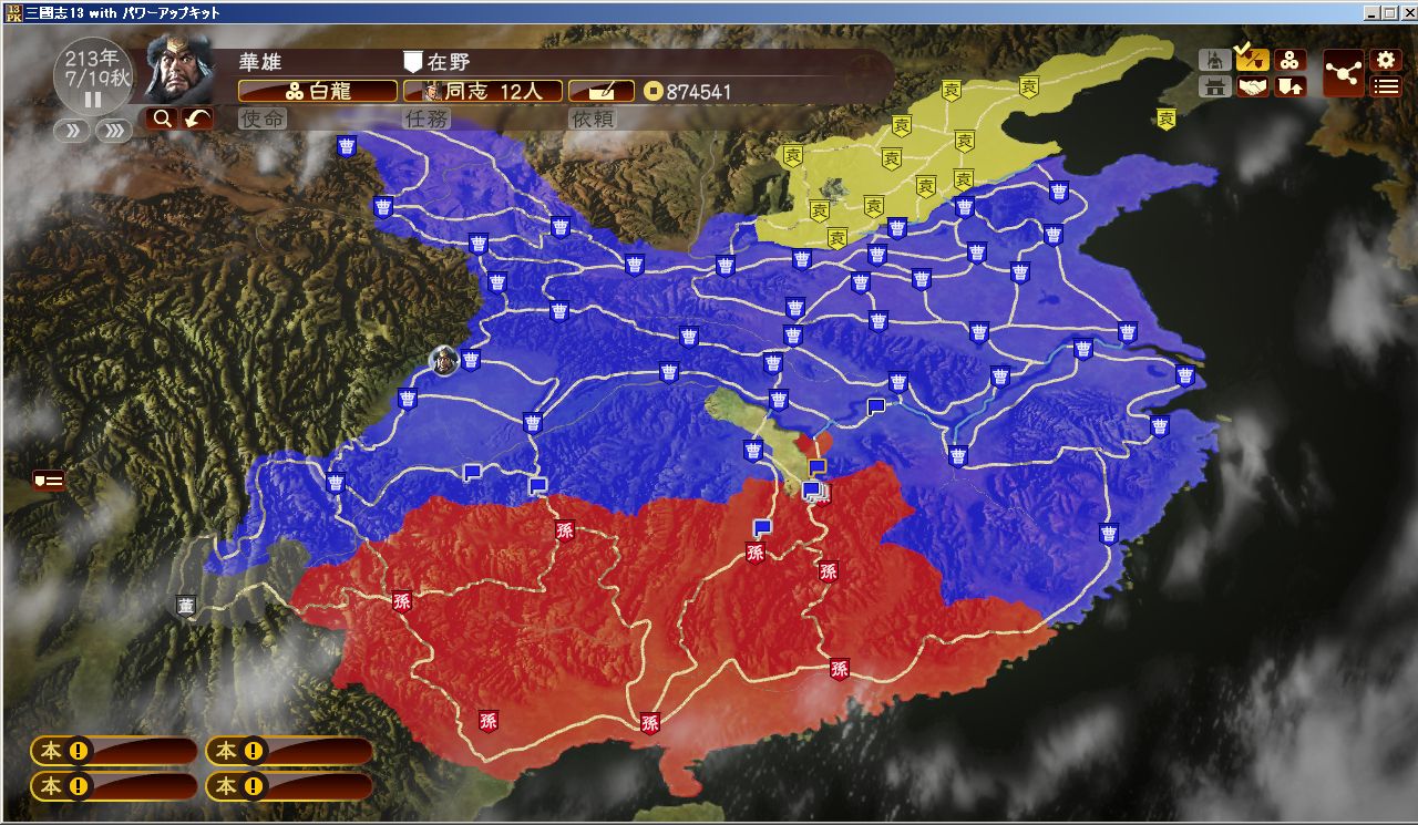 当初は白龍としてせっせせっせと在野の士を曹操勢力で武将推薦を繰り返し、推薦した武将はすぐさま一品官まで抜擢させ、大投資は欠かさず行い、とにかく影響力を高めた。んで放って置いたら下手な戦ばかりにするので、細かく攻略方針を提案。ついでに曹操と徹底的に仲良くなって義兄弟の契りを交わしちゃった。
