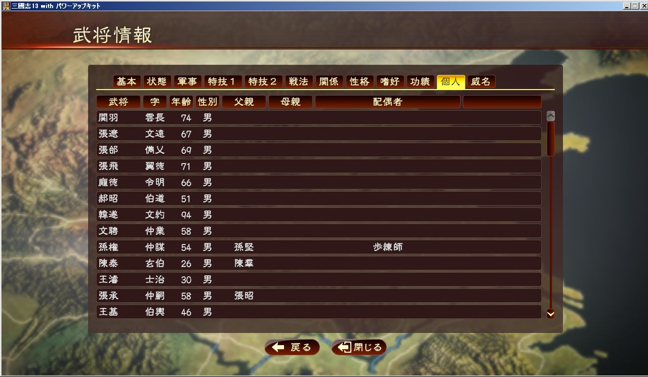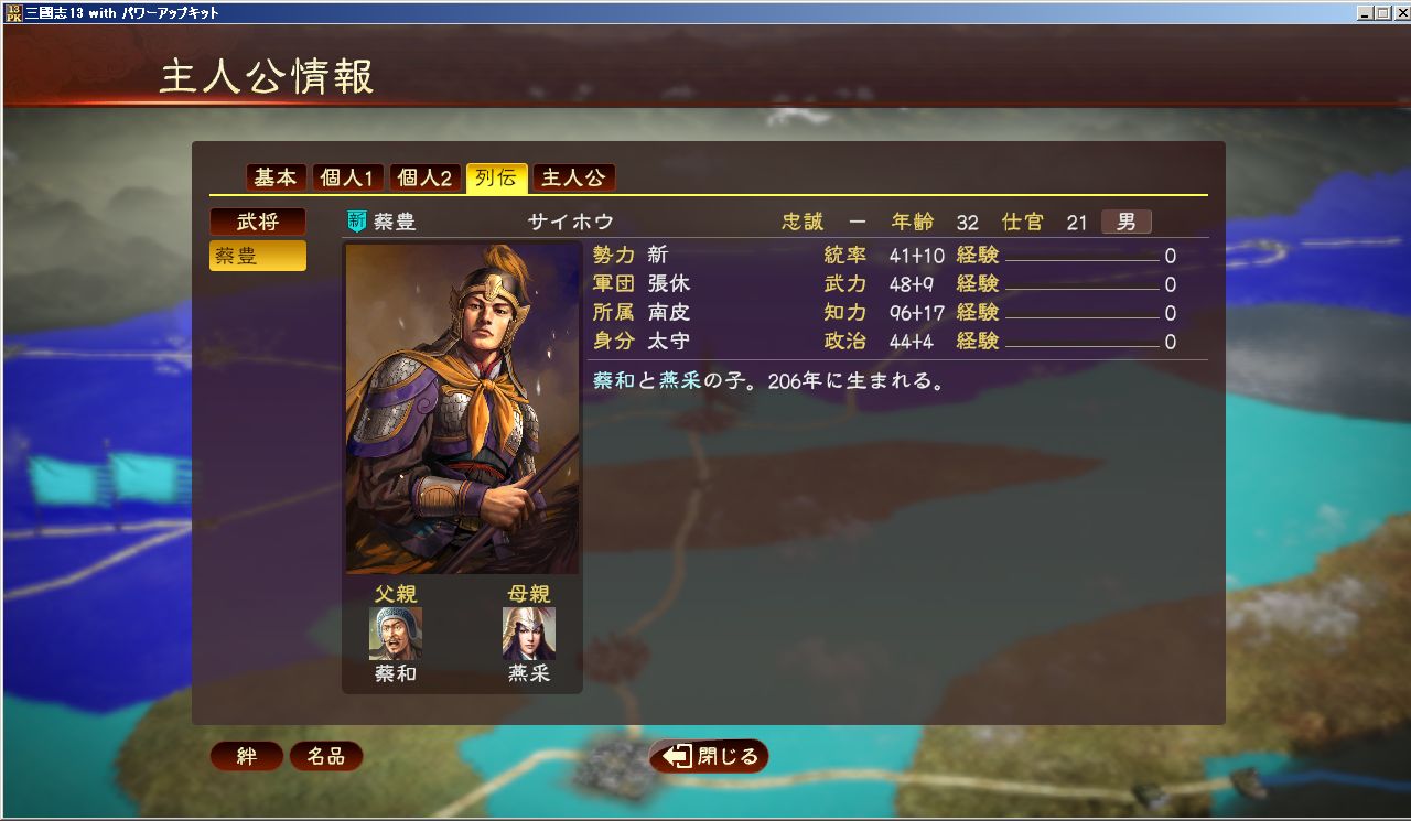 ・・とスタートしてみたけど、やっぱ同志作りが肝心っしょ。というわけで弟の蔡中を同志にして彼伝いに絆武将を増やす作戦に出てみた。劉表軍にもそれなりの武将はいるので、最初は一切政務にも関わらず(苦笑)、本人は訪問、弟には親書を書かせてばかりの日々。