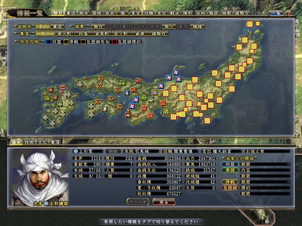 とうとう宿敵・今川家を追い詰めた。残すは引馬城の一城のみ。篭る今川義元と武田信玄は生け捕りにして、上杉家に取り込みたかった・・・けど、滅亡後に他の武将が続々と傘下に加わる中、この二人だけは憎しみが強いらしくて一向に首を縦に振ろうとしない。残念。