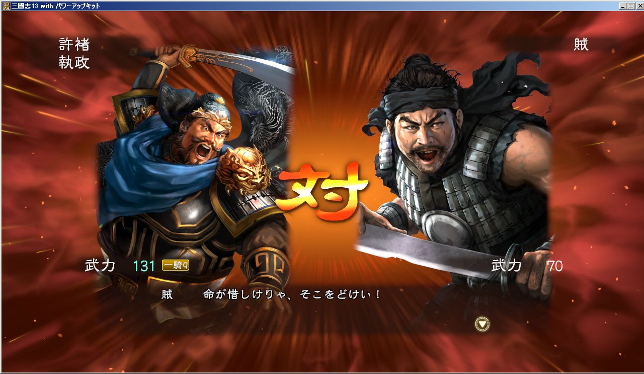 237年には孫呉を完全に滅ぼし、曹家も最早息も絶え絶え状態。袁家を継いだ辛家なんて武将10人程度で勢力の体を成していない。あと一押しって時に、許褚ご臨終。69歳。最期は武力131、一騎9。