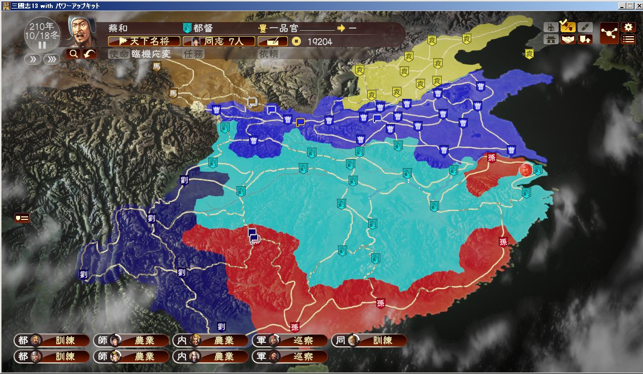 まずは史実どおり、曹操陣営で働くことに。それにしてもこのゲームって、本当に簡単に出世するなあ。あっちゅー間に一品官だ、重臣だ、太守だ、都督だー!!