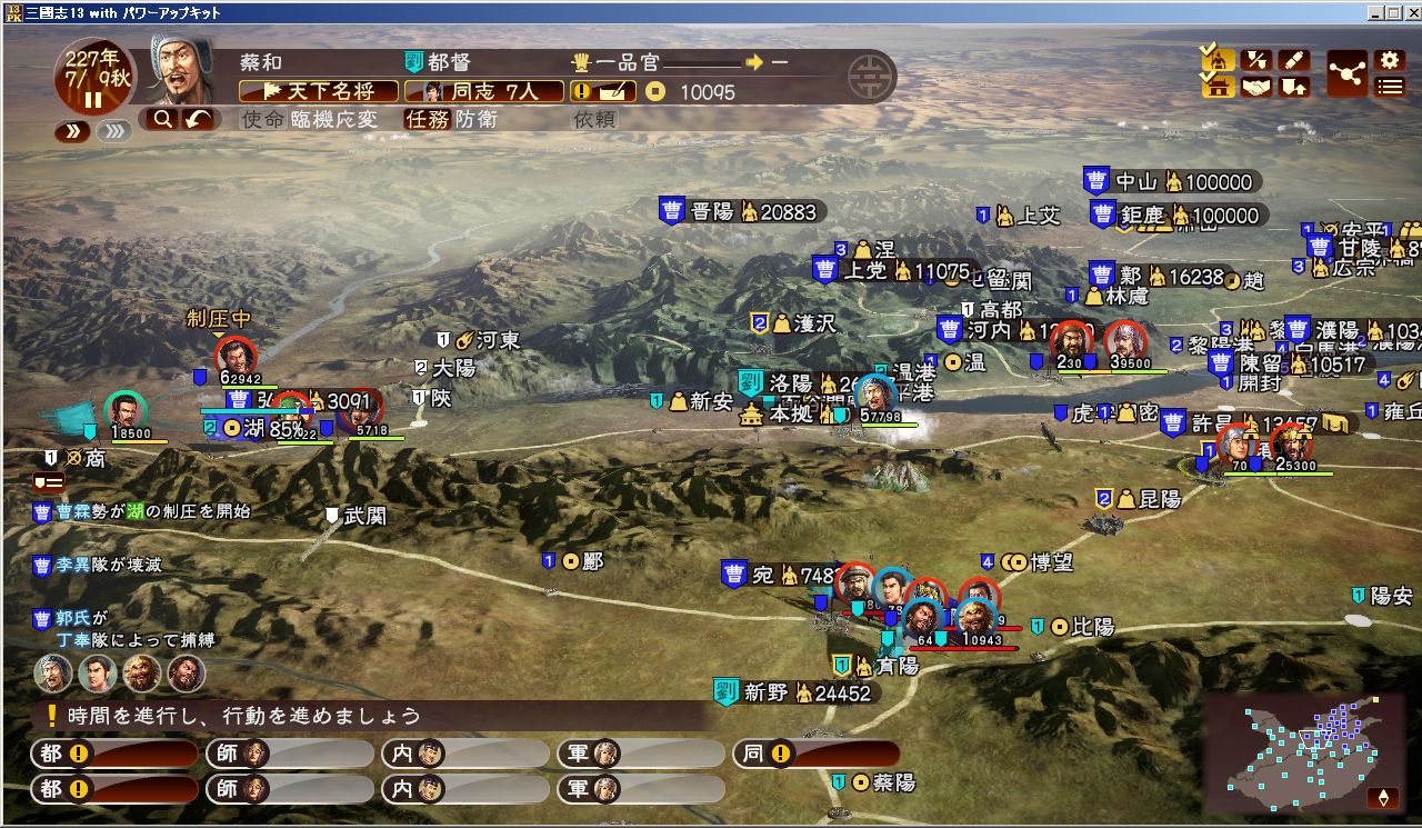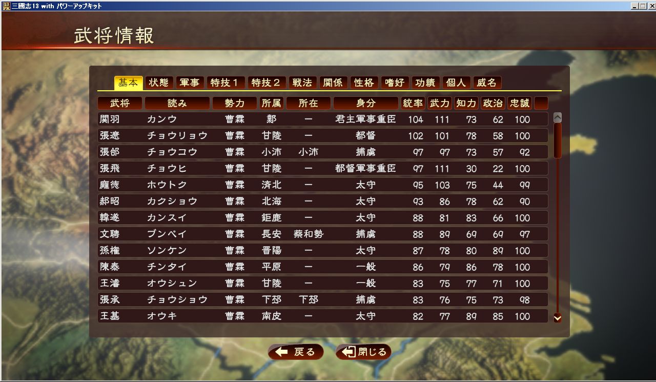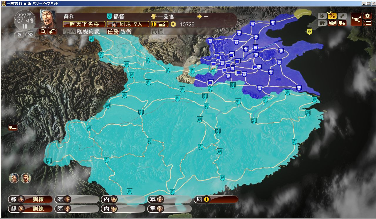 でも長年参軍を務めてくれた荀攸や劉曄、そして後継の孔明が次々と世を去った時は秋風が吹いた。もしや健康とかの隠しパラメータがあって、大遠征の影響が出たんじゃないかと疑ったりもした。ま、所詮自分如きじゃそんなの分からないけど。後任の陸遜がなんとか穴を埋めてくれた。