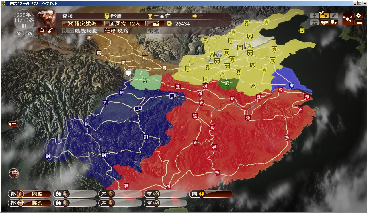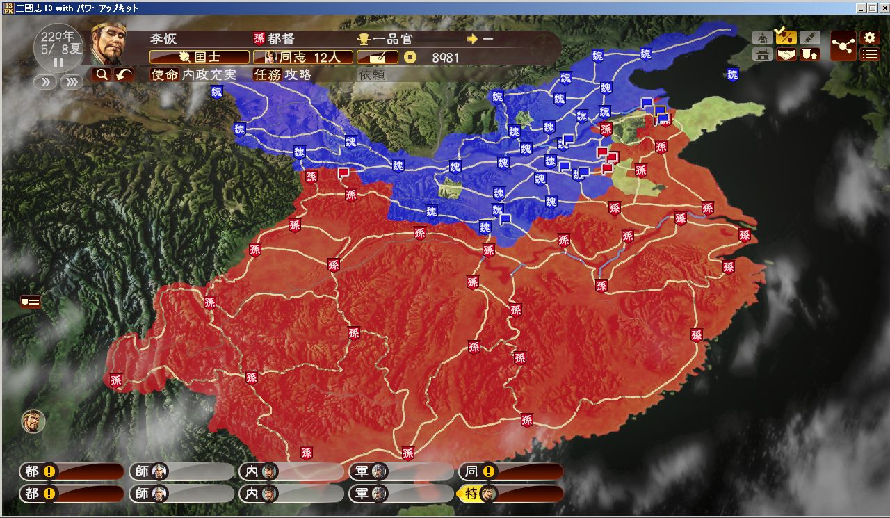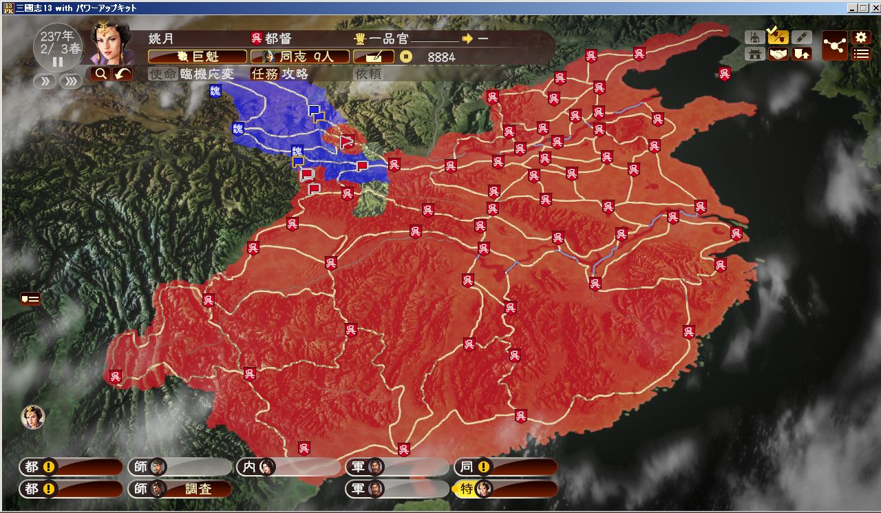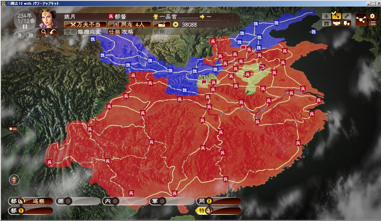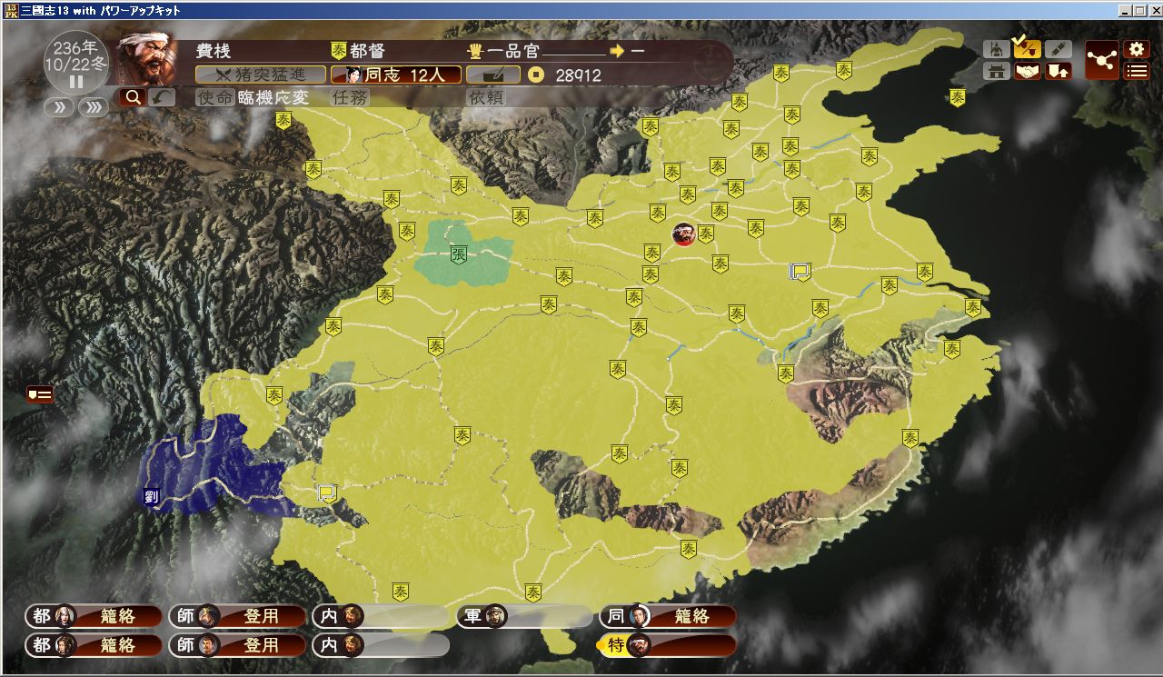 この姚月、統率・武力は関羽と並べるほどの性能を誇っており、知力・政治はまずまずの生粋の武人。早速、都督に任命され、李恢軍の跡を引き継いだ。でも軍師プレイ中だからな~。巨魁目指して、しばらく条件達成に勤しむかな~。その間に魏に都市を奪われまくらなければいいんだけど。心配だなあ~