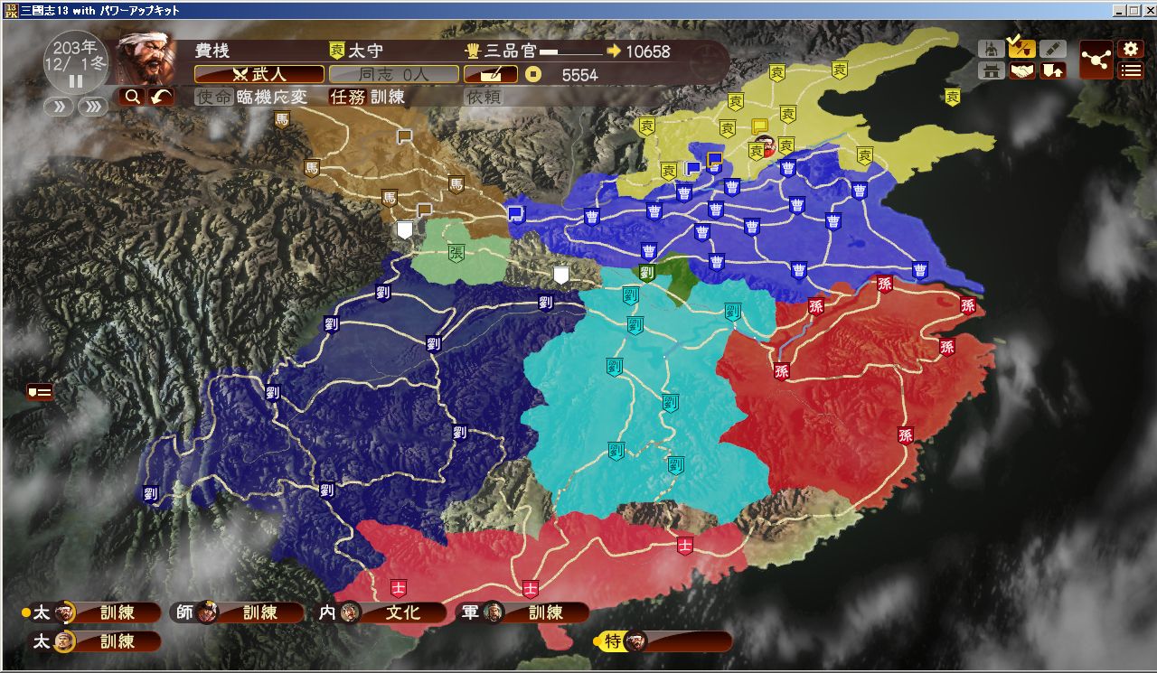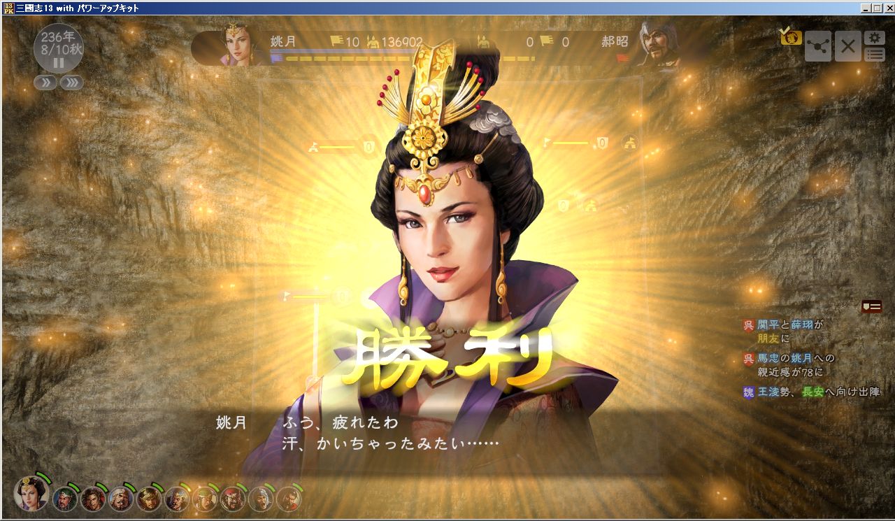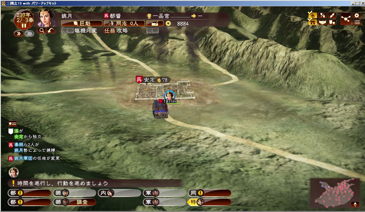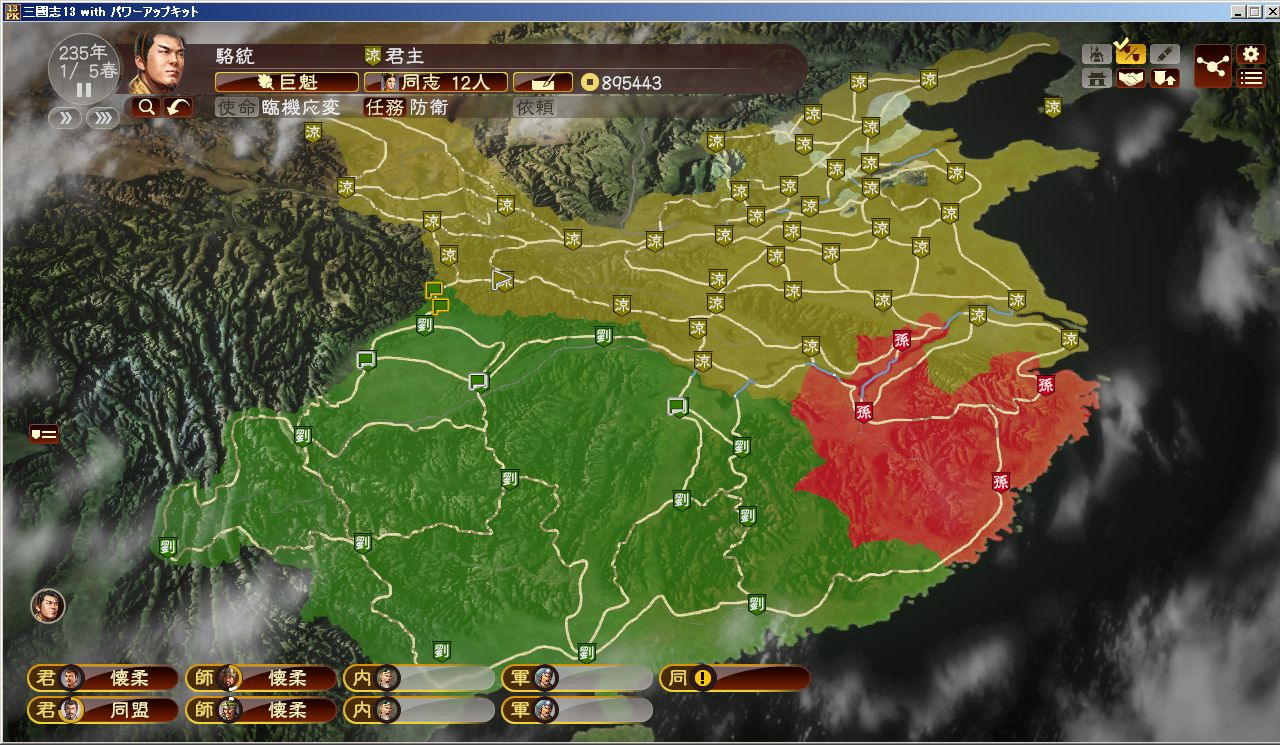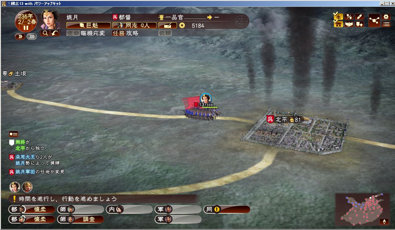 この姚月、統率・武力は関羽と並べるほどの性能を誇っており、知力・政治はまずまずの生粋の武人。早速、都督に任命され、李恢軍の跡を引き継いだ。でも軍師プレイ中だからな~。巨魁目指して、しばらく条件達成に勤しむかな~。その間に魏に都市を奪われまくらなければいいんだけど。心配だなあ~