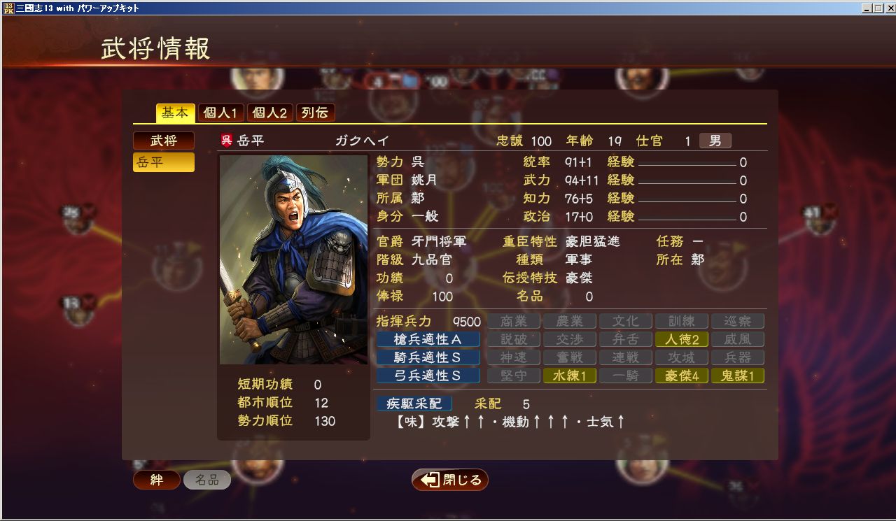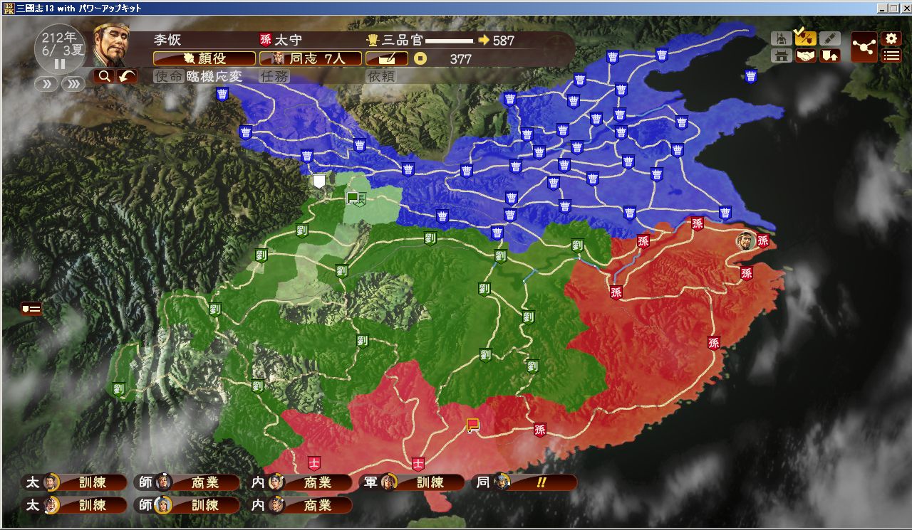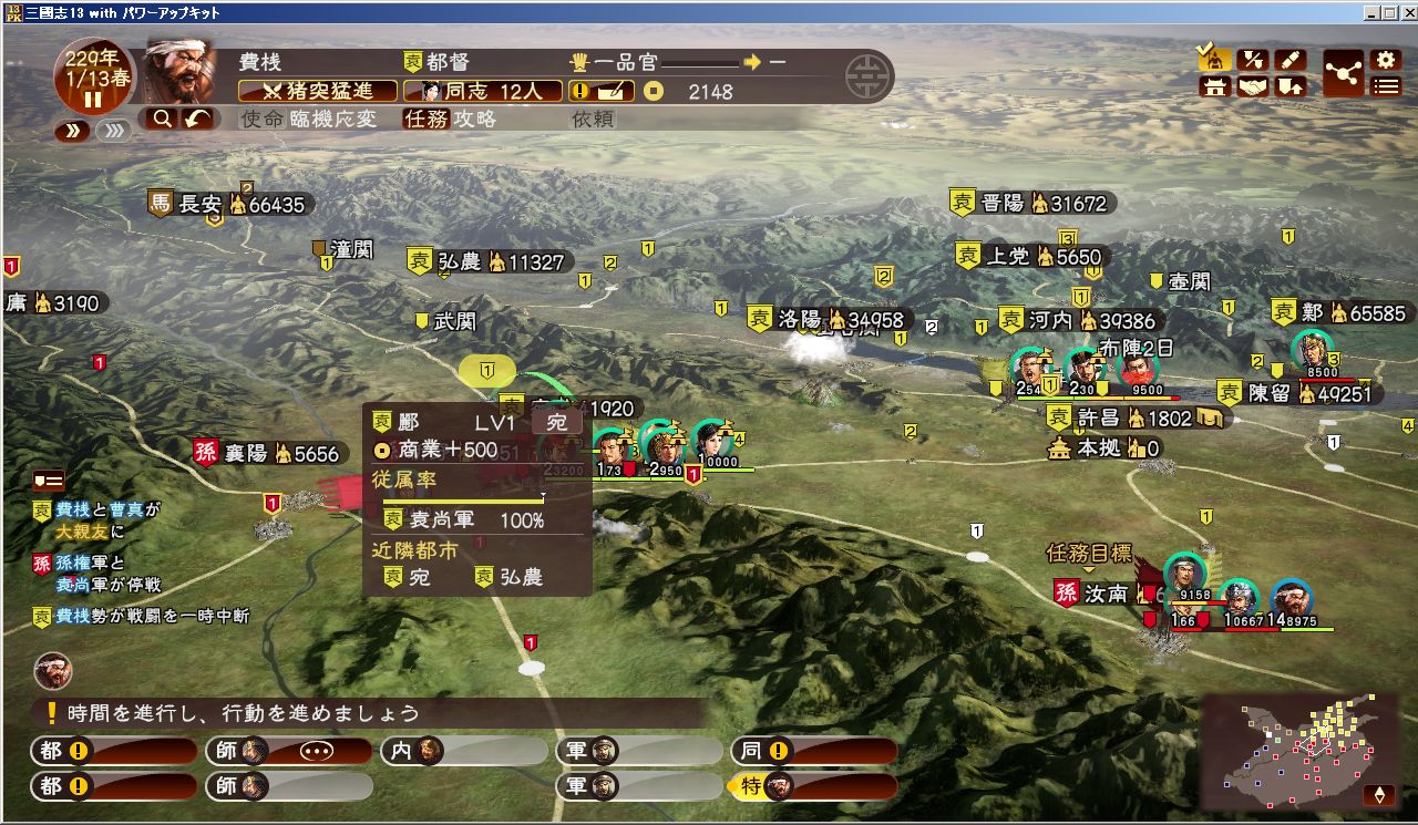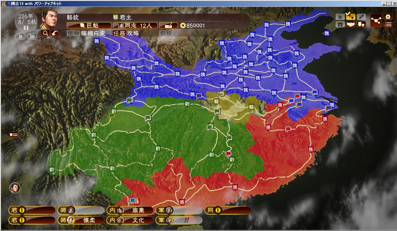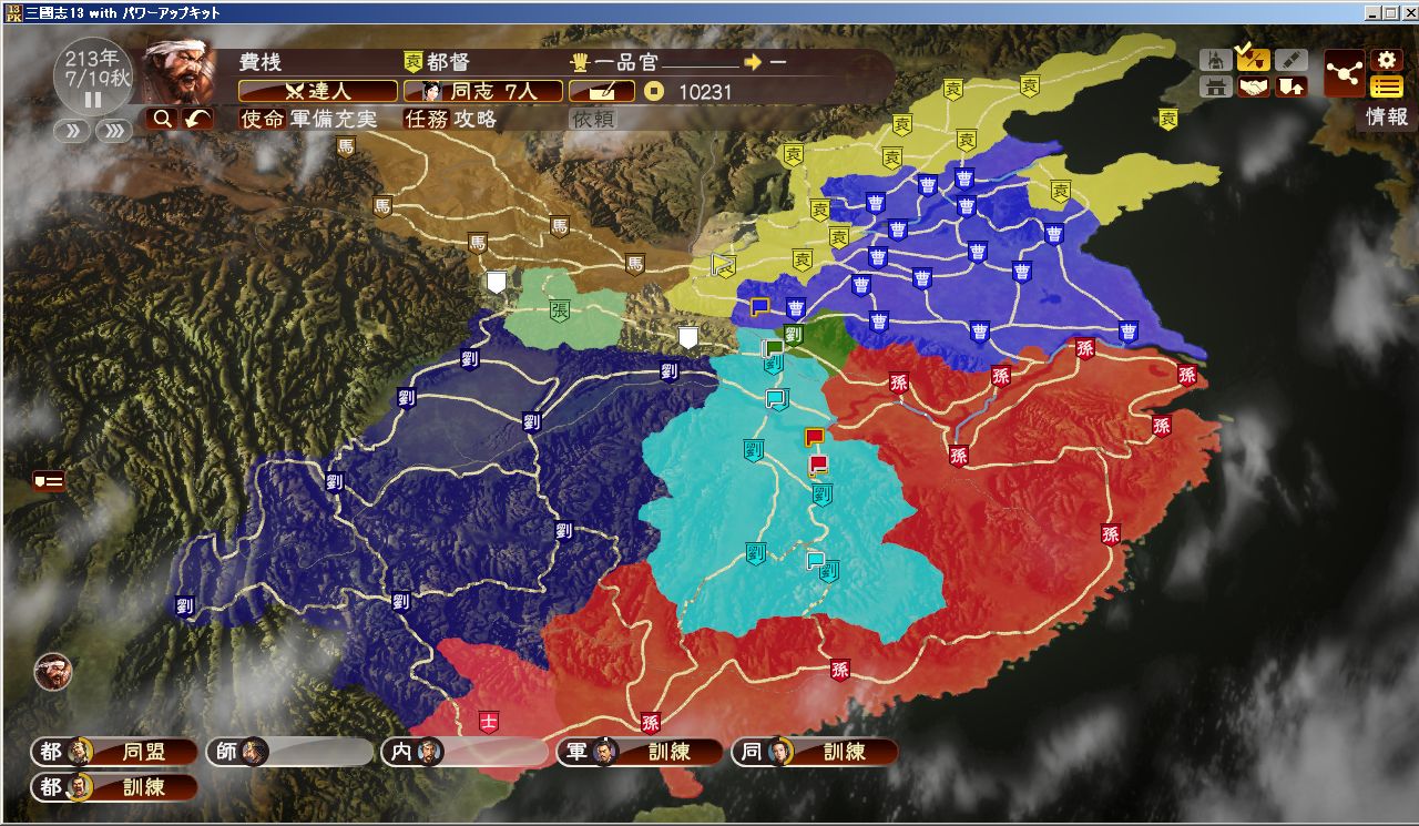 この姚月、統率・武力は関羽と並べるほどの性能を誇っており、知力・政治はまずまずの生粋の武人。早速、都督に任命され、李恢軍の跡を引き継いだ。でも軍師プレイ中だからな~。巨魁目指して、しばらく条件達成に勤しむかな~。その間に魏に都市を奪われまくらなければいいんだけど。心配だなあ~