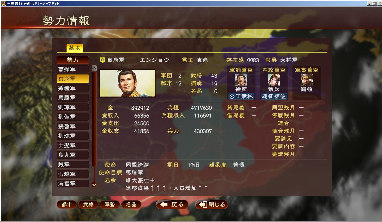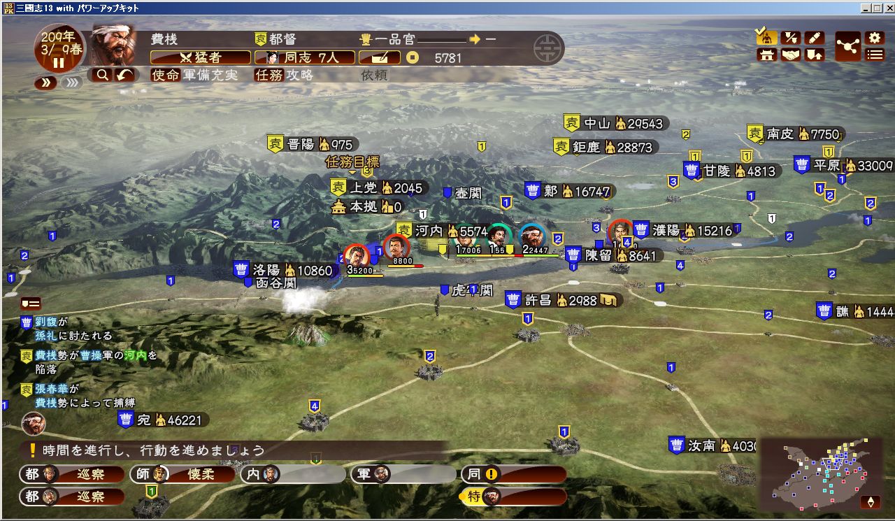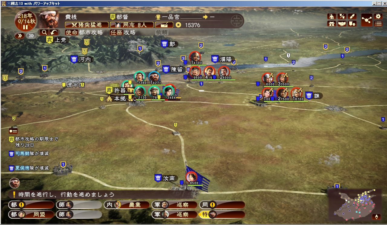 とにかく同志を募るべえ。嫁っこさもらうべえ・・と暢気にプライベート楽しんでたら、歴史イベントが怒涛のごとく起こって、あれよあれよという間に袁家がどんどん衰退していきやがる。曹操軍は次々と黄河を乗り越えて、侵略してきよるし。実際にかなりの領地を奪われたし。マジであせったわ~。