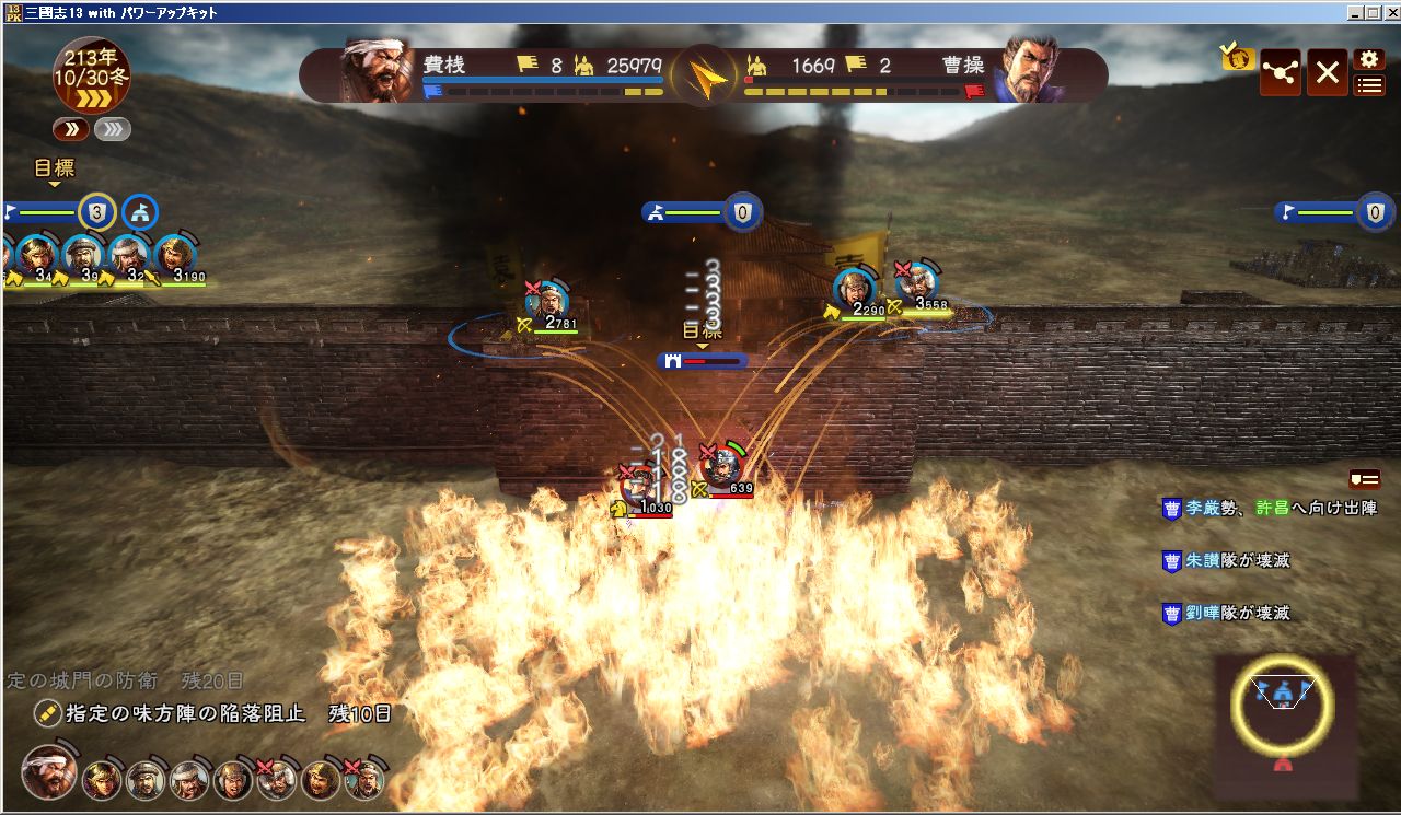 だけど配下武将の一人が持っていた「火攻計」という戦術が、ここでブレイク。マイブームになったこの戦術は、特に防衛線においてむちゃくちゃ使える。関でも城でもとにかく門前まで敵を引きつけ、火攻計を連発。さらに弓隊も配置すれば凶悪の1語のみ。