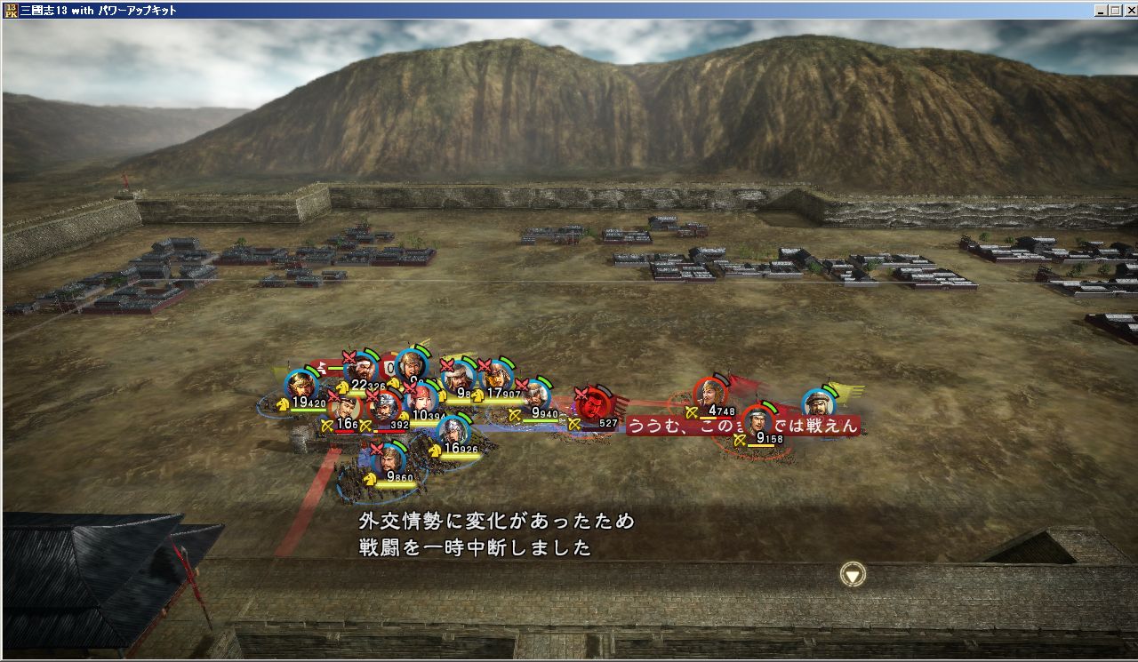 孫策はよほど費桟軍を恐れたとみえて、再三の停戦を申し込んできた。一度は特権使って、すぐに停戦を取り消したものの、またすぐに停戦を申し込んできて、うちの首脳陣はアボやからすぐに停戦を受け入れよった。その間に汝南攻略だけはできたけど、一気に孫策軍のあちこちに攻めかかろうとしていた友軍は皆解散。振り上げたこの拳をどうすりゃいいんじゃ~~