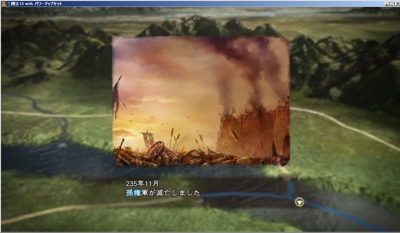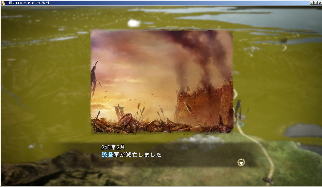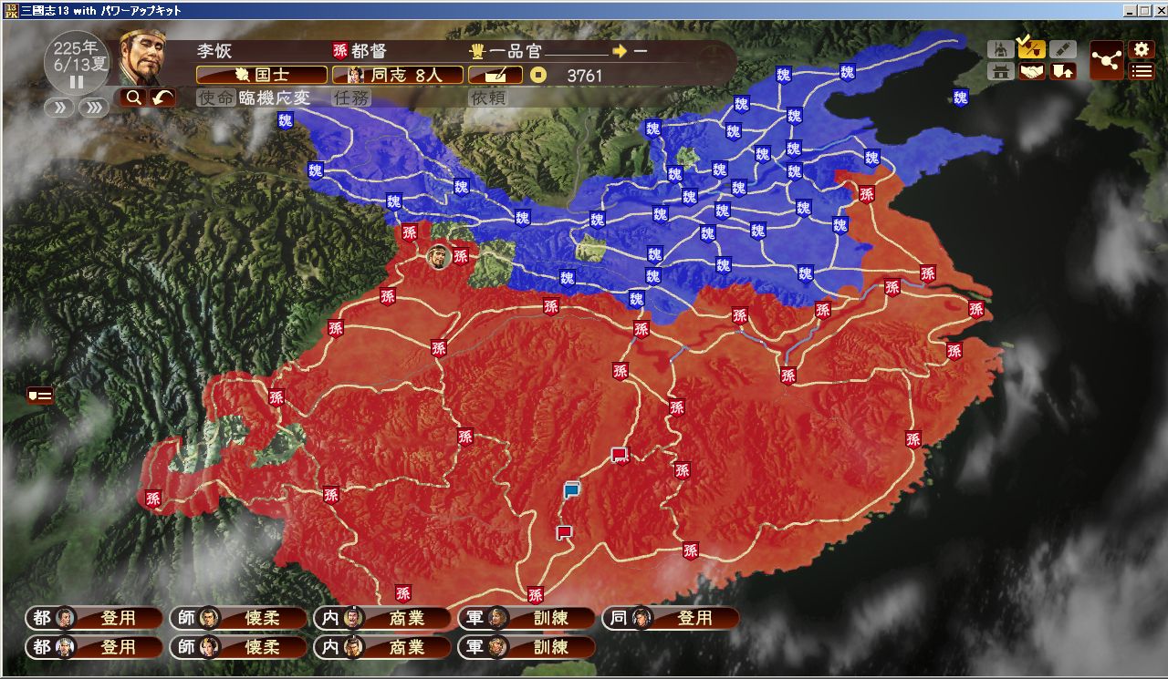 案の定、戦が楽になり、李恢軍はもう何年も遠征に出続けているのに、兵を一向に減らさず(むしろ増やして)、魏軍を追い詰めている。とうとう孫権は皇帝になり、国は呉となった。だが時既に遅し