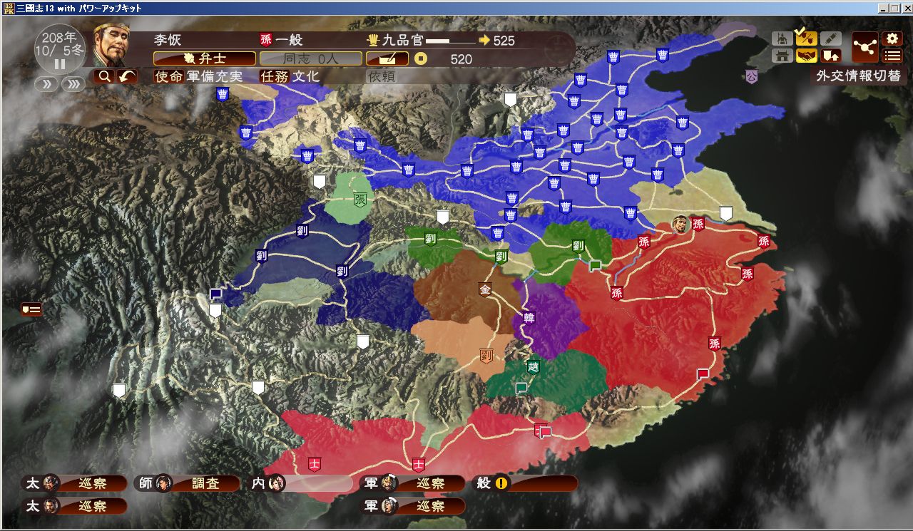 さて本来なら劉璋か劉備に仕えるべきだったんだろうけど、まだちゃんと仕えたことのない孫呉勢力に行ってみた。劉備ン所はこれから大変だろうし。とりあえず、ゆっくり友達でも作るべえ・・っと思ってたら、歴史イベント(劉備逃亡、荊州降伏、赤壁炎上、馬騰昇天)がどんどん起こって、あっちゅー間に勢力図が塗り替えられた