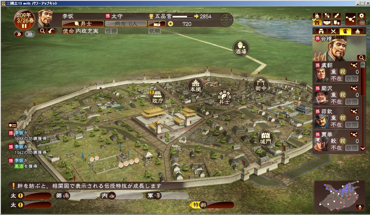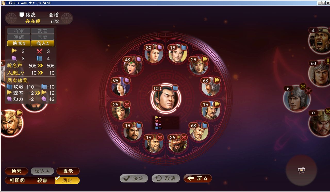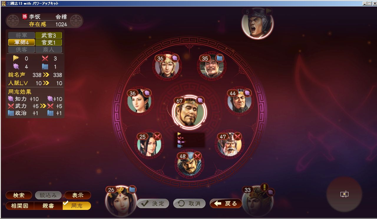 で、今頃ようやく気付いたけど、勢力内で友達作るなら、まず偉くなることが肝心だわ。太守になったら、部下達は論議を断らなくなりよった。あー随分と遠回りしてしまったわ。まずはさくっと蒋欽と絆を結べた。一人結んだら、後は芋づる式。親書って便利よなあ。