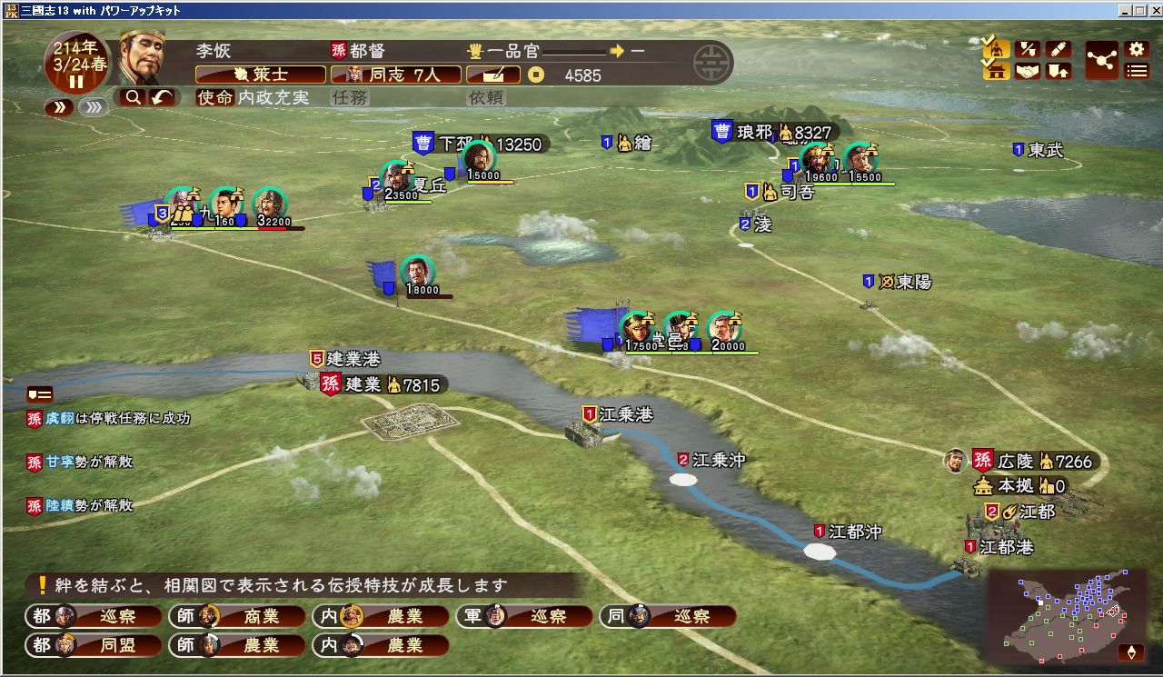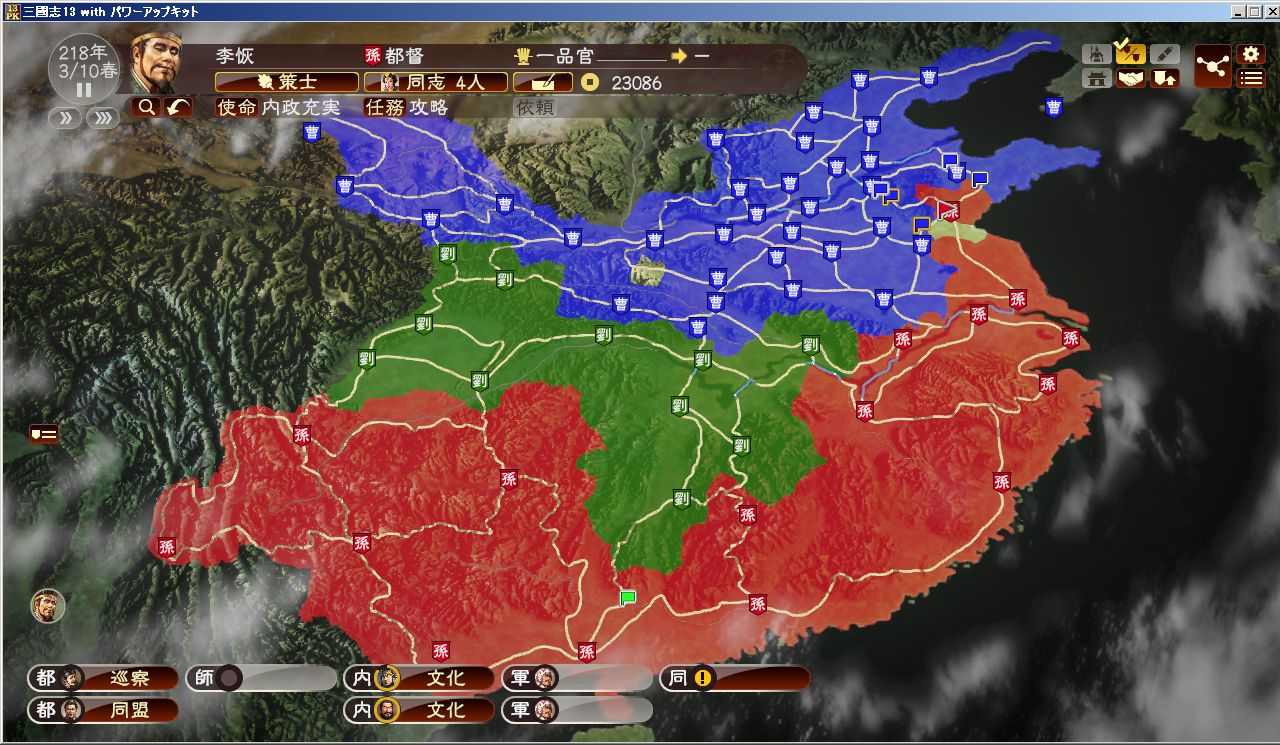 歴史イベントの波は止まらない。劉備入蜀で三国鼎立かよ。曹操も劉備も人材増やしすぎ。もうそろそろ動かないとやばくね?というわけで、手薄そうな広陵を攻めてみた。周囲からの援軍もいっぱい来たけど、すでに都督に就任していた李恢の命令で、傘下の都市からも増援があり、数で押し切った。よっしゃあ!