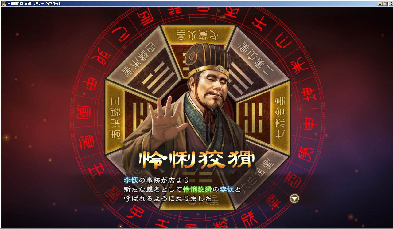選んだのは、本シナリオ中、まだ在野やってて、腹に一物ありそーなビジュアルの李恢!