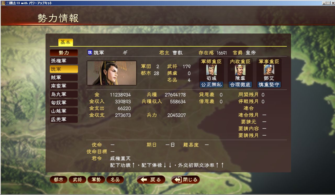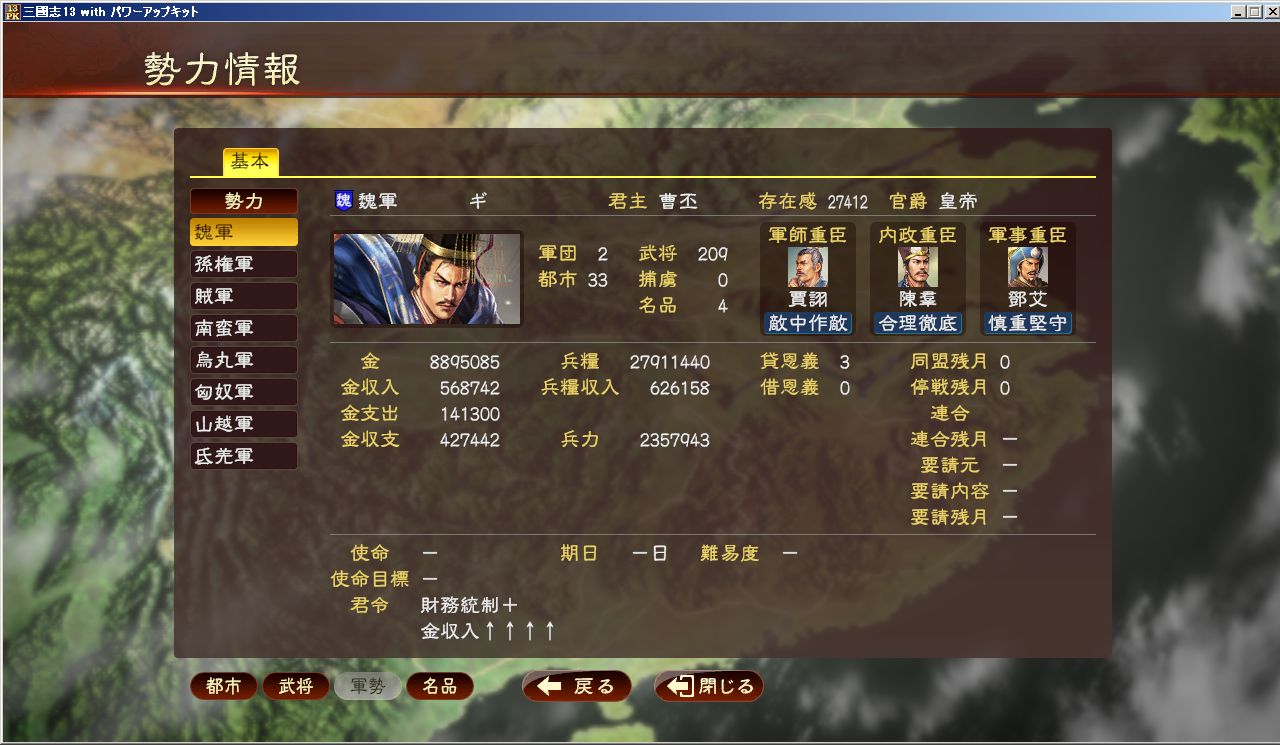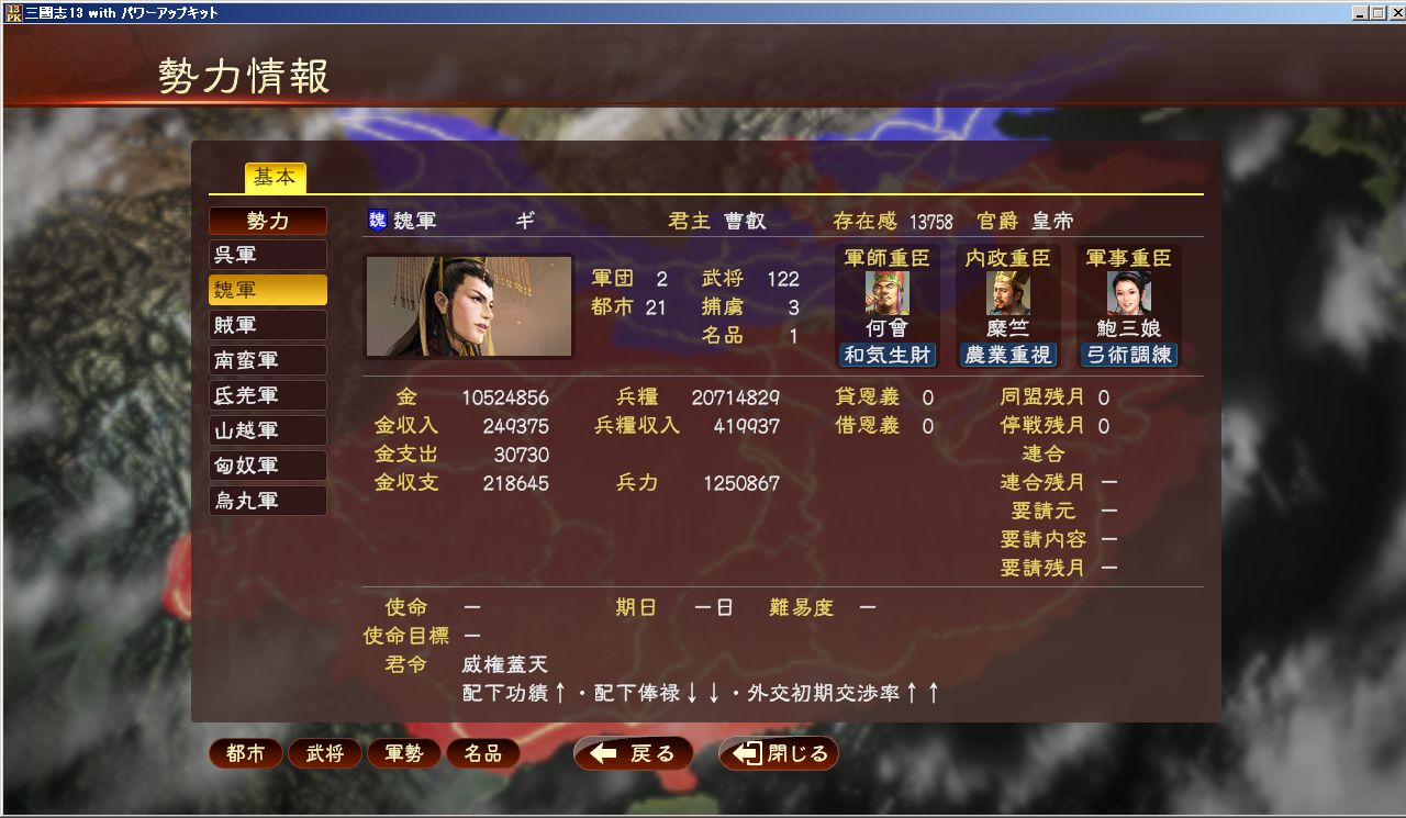 魏 都市:21、武将:122、兵力:125万、捕虜:3