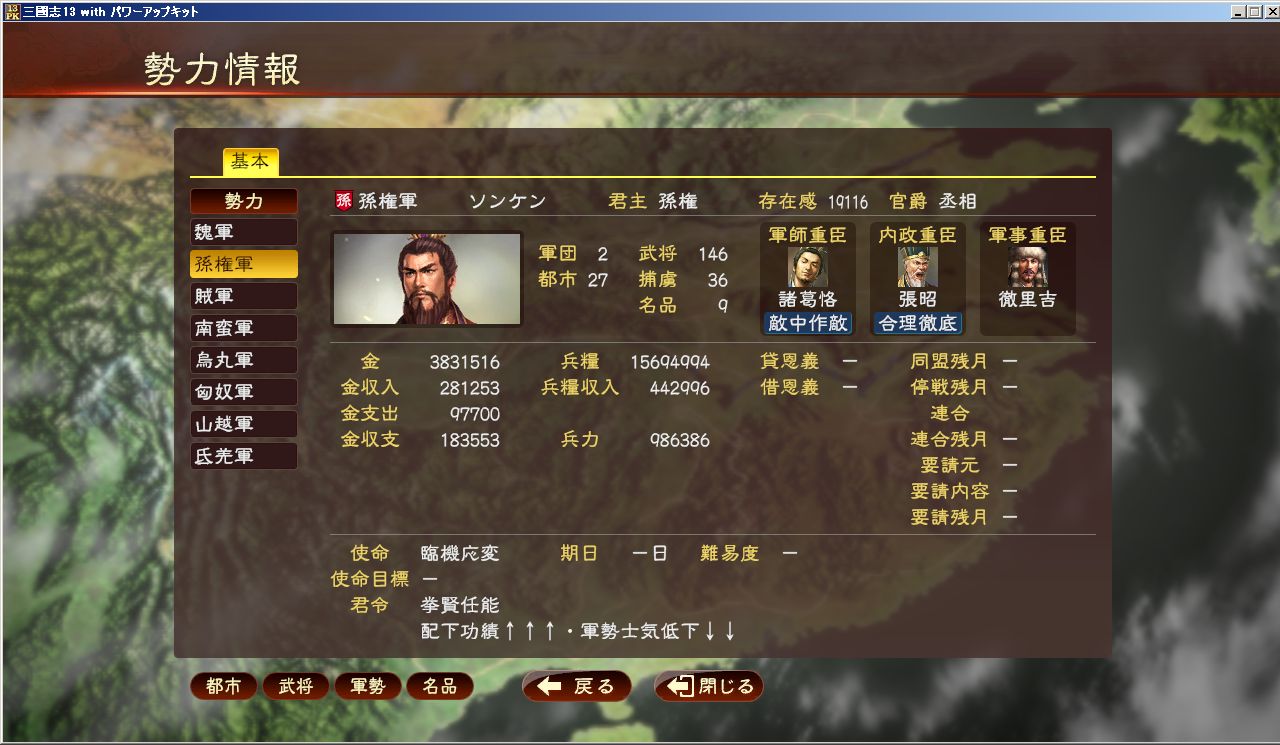 孫権軍 都市:27、武将:146、兵力:99万、捕虜:36