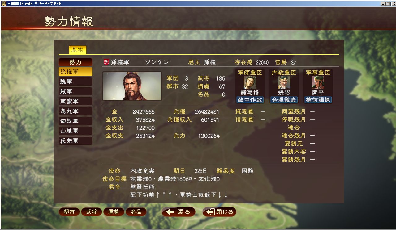 孫権軍 都市:32、武将:185、兵力:130万、捕虜:67