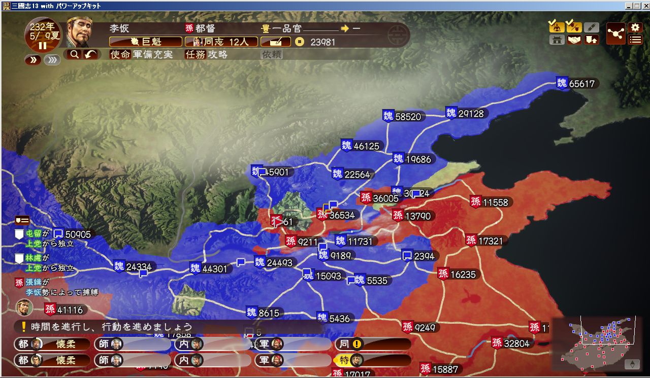 いつ終わるとも知れない死闘を続けていたけど、黄河以北を荒らしまくった挙句に、ようやく都市数と武将数が逆転した。ちなみにこの頃、曹丕.が死んで、史実どおり曹叡が跡を継いでる。