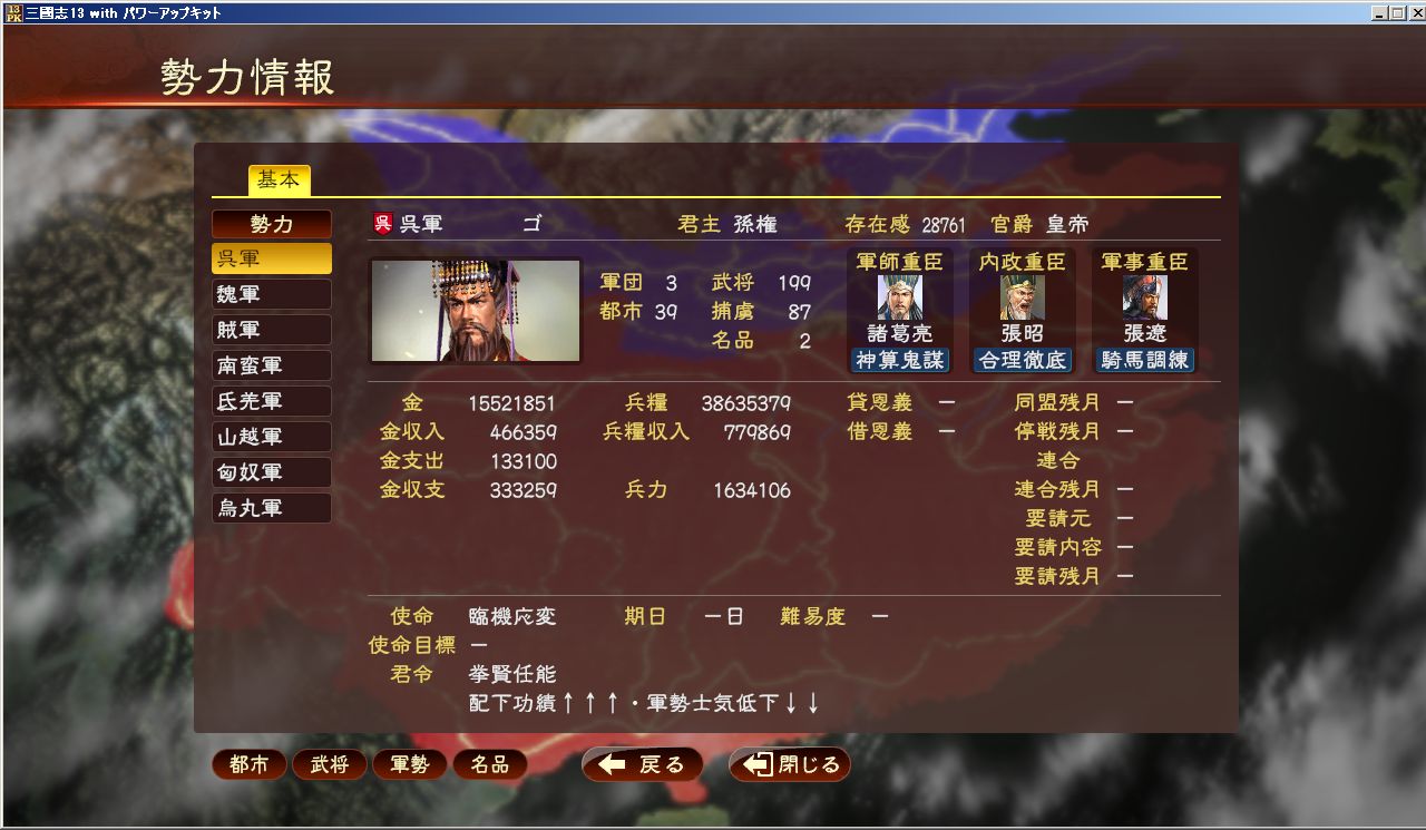 呉 都市:39、武将:199、兵力:163万、捕虜:87