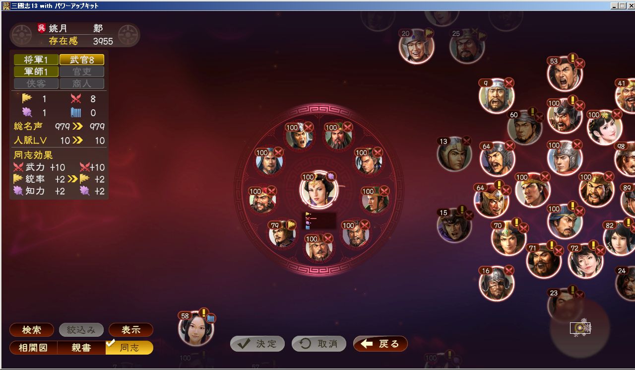 ここに来て、攻略はAIに任せて、こちとら元孫策軍の武将の取りこみと最強の同志作りに奔走。関羽、張飛、夏侯淵、甘寧、張遼、張郃、徐晃、龐徳とこの時生き残ってる中で最強の武力を誇る武将を上から順に集めて全員同士にしてやった。