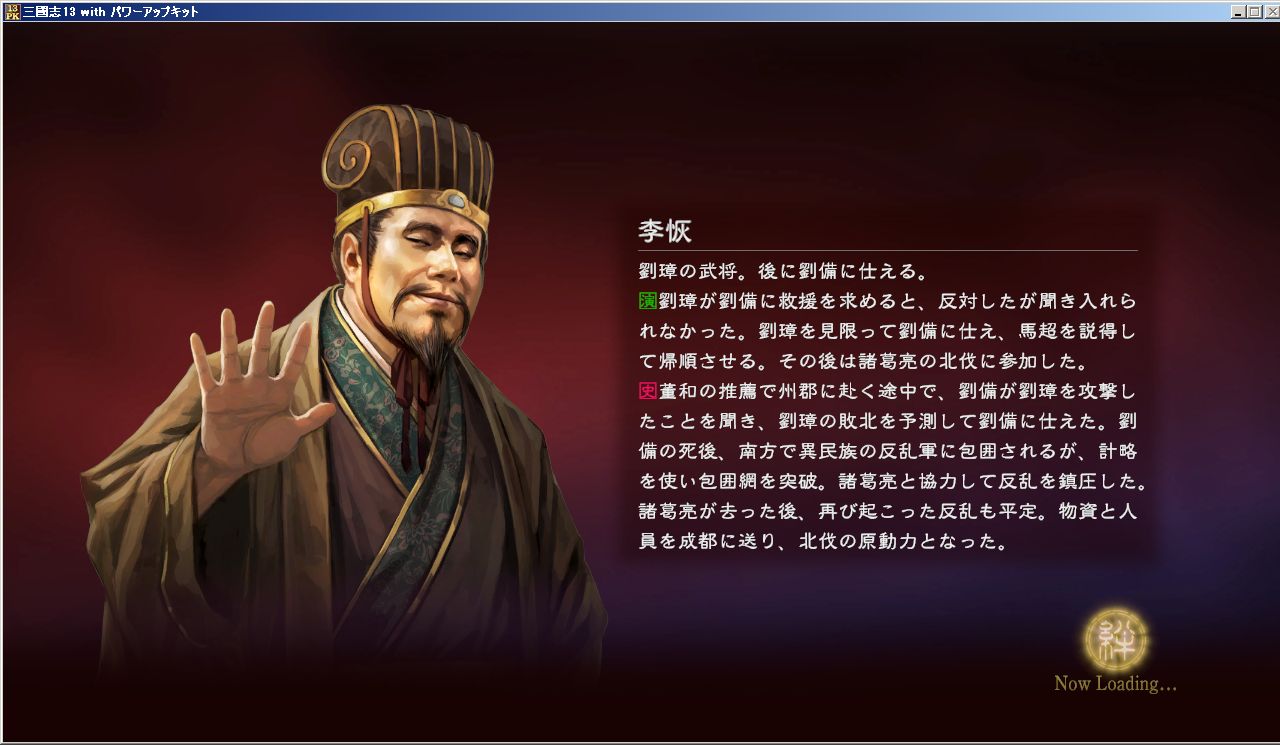 選んだのは、本シナリオ中、まだ在野やってて、腹に一物ありそーなビジュアルの李恢!