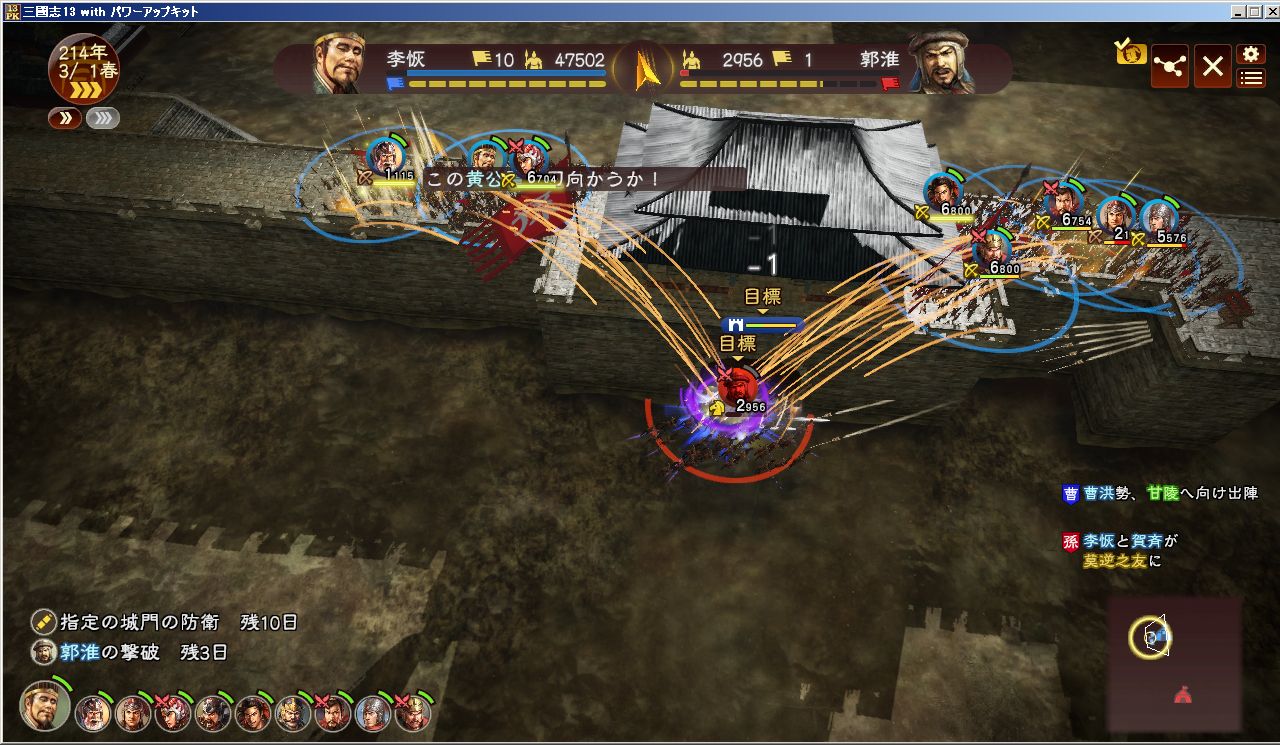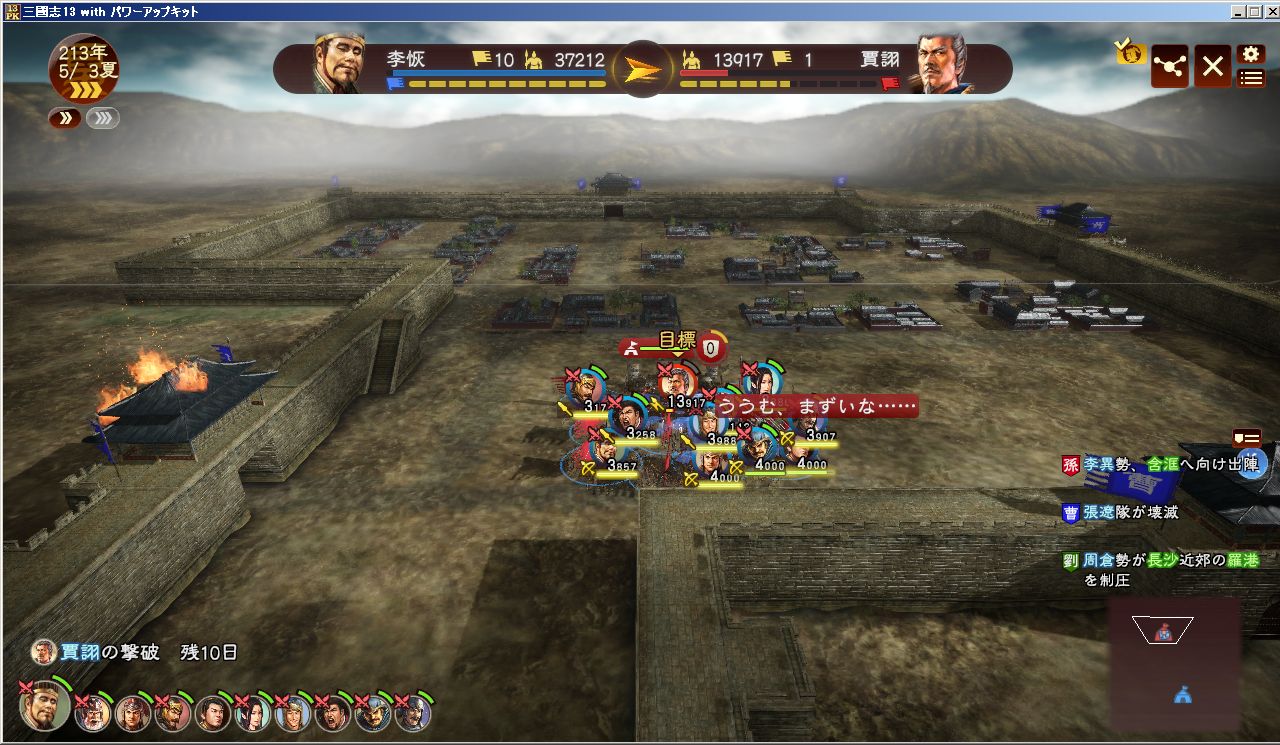 歴史イベントの波は止まらない。劉備入蜀で三国鼎立かよ。曹操も劉備も人材増やしすぎ。もうそろそろ動かないとやばくね?というわけで、手薄そうな広陵を攻めてみた。周囲からの援軍もいっぱい来たけど、すでに都督に就任していた李恢の命令で、傘下の都市からも増援があり、数で押し切った。よっしゃあ!