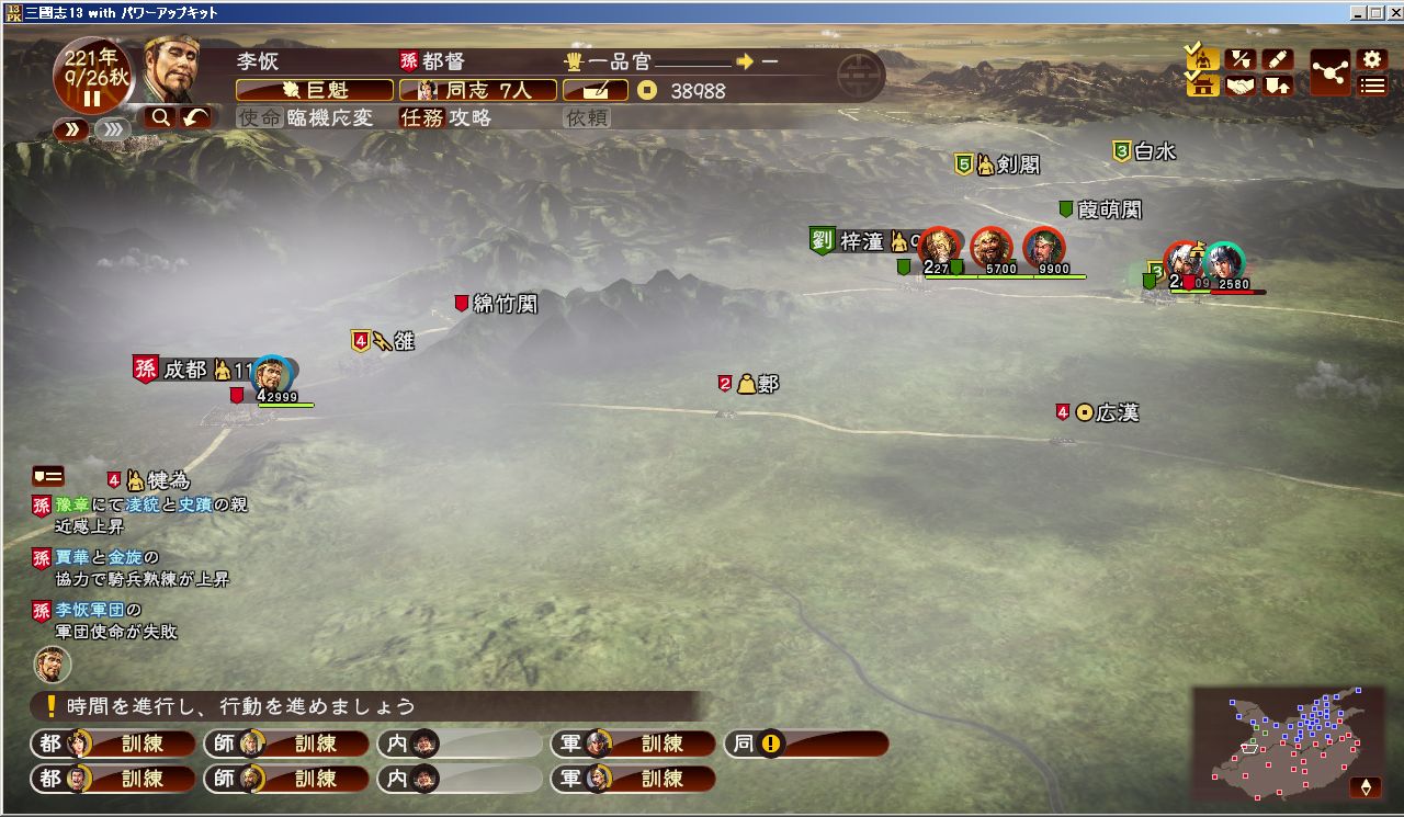 この姚月、統率・武力は関羽と並べるほどの性能を誇っており、知力・政治はまずまずの生粋の武人。早速、都督に任命され、李恢軍の跡を引き継いだ。でも軍師プレイ中だからな~。巨魁目指して、しばらく条件達成に勤しむかな~。その間に魏に都市を奪われまくらなければいいんだけど。心配だなあ~
