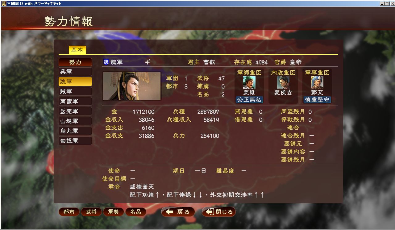 最終的に兵数は26万を超えました。ひとつの勢力として、独立しても十分にやっていけそうやな~emoji気が向いたら、そういうプレイもいいかもしれんな~。ってな感想を抱いて、ようやく軍師編の終了で~す。
