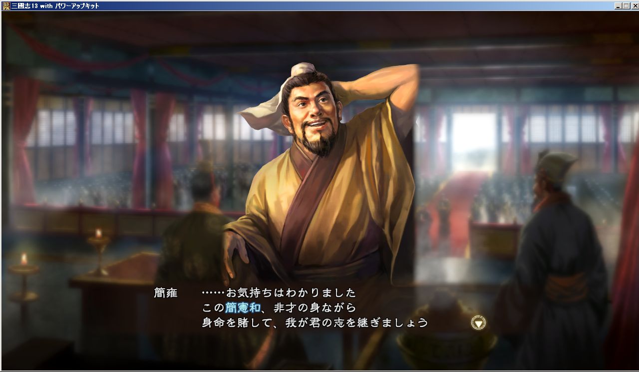 まずはさくっと譲位して下野します。簡雍・・君主譲られて、な~んかまんざらでもない感じ。関羽には引き止められるけど、すまん。決意は固いっす。
