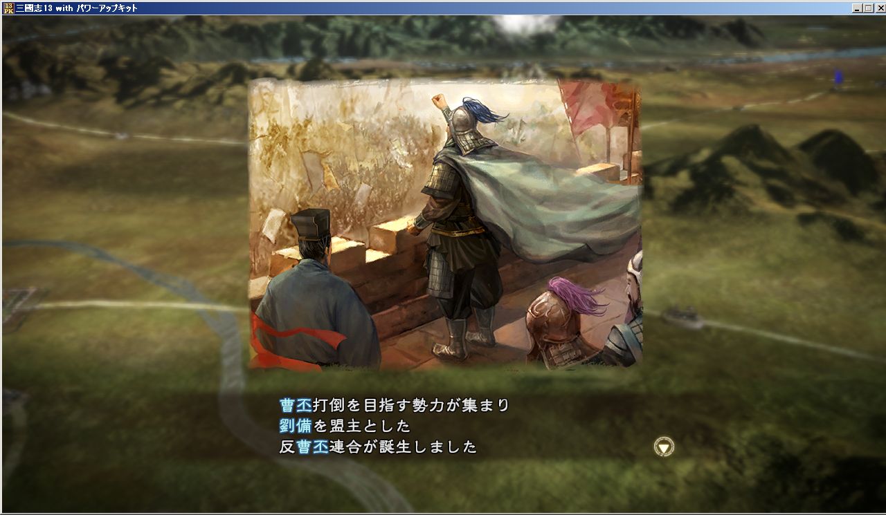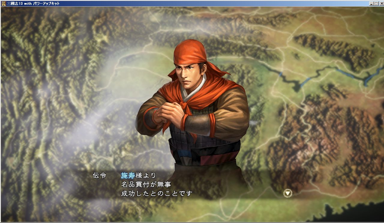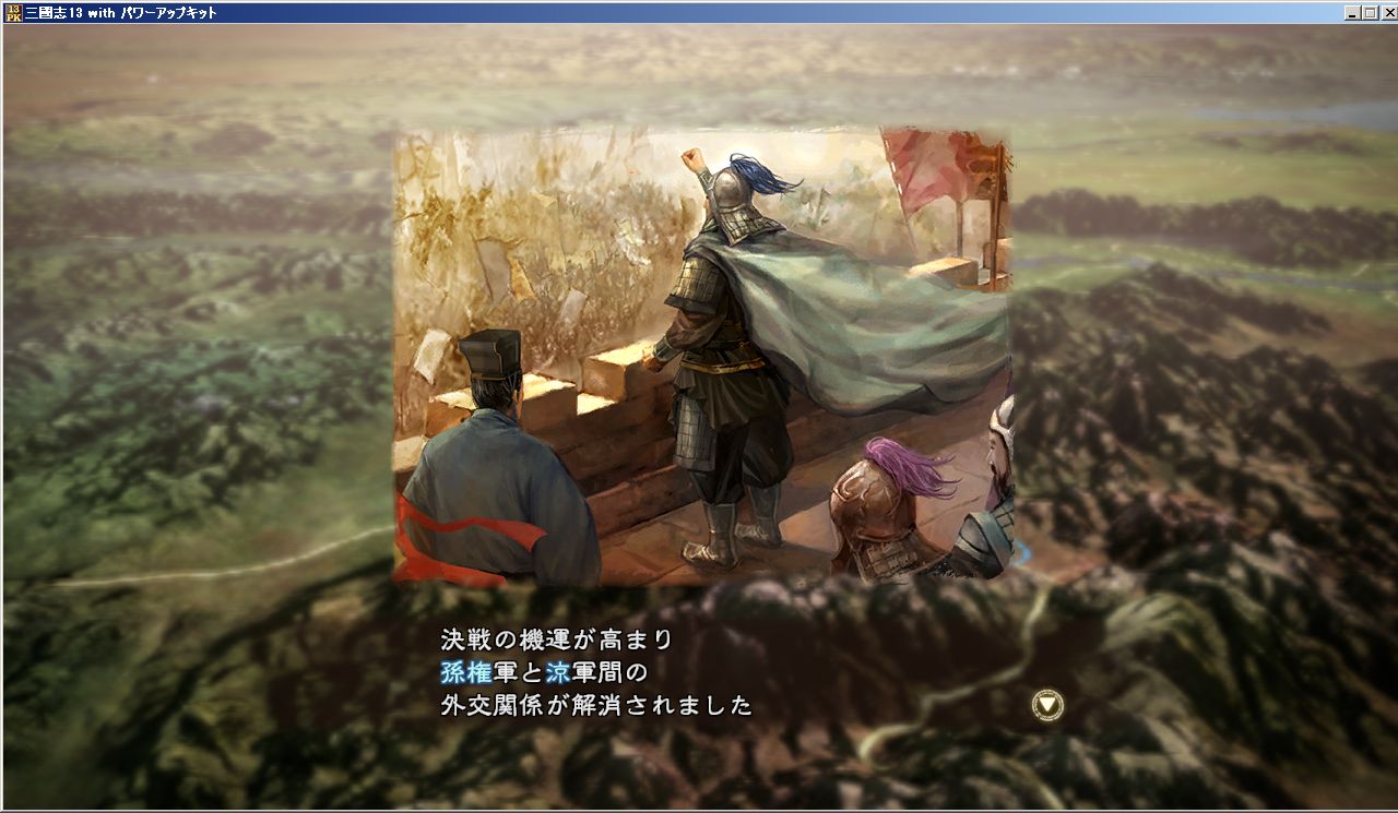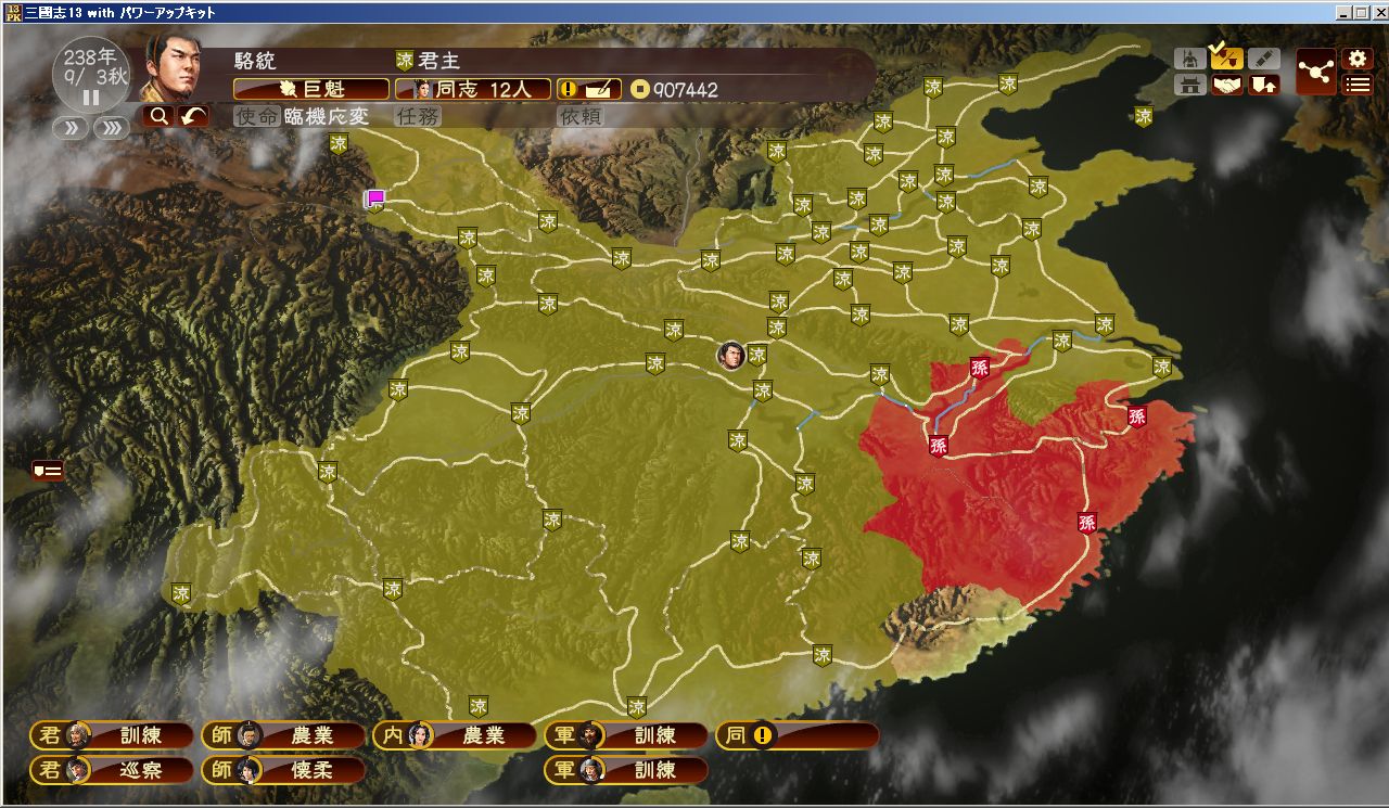 「あ、そうだ。どうせ君主プレイやってるんだから、超困難ミッションを達成しとこう!」・・と、孫権軍に手を出すのを一旦止めて、勢力使命の達成に挑むのを決意。評定開いて、適当なミッションを作り上げ、委任状を出しまくって、条件達成に挑んだ。本人は関羽や張飛、張遼、龐徳といった有能武将を同志にすべく、スカウトに勤しんだ。