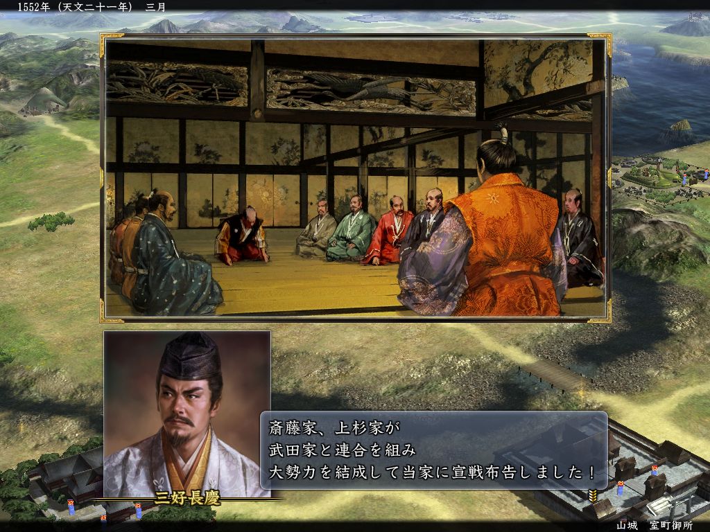 細川家の強大化に脅威を感じていた武田晴信は隣国の斎藤家、上杉家に呼びかけを行い、武田家を核と成す大連合を結成した。思わぬ強敵が東に出現したことで、長慶は主だった重臣を集めて評定を開いたが、対細川包囲網の為に兵を長期に渡って酷使し続けてきた現在の状況では、新たな出兵を行うことは早々にできるわけもなく、前線となる小谷城を中心として東の守りを固くして敵の襲来に備えることが決したのみだった。
